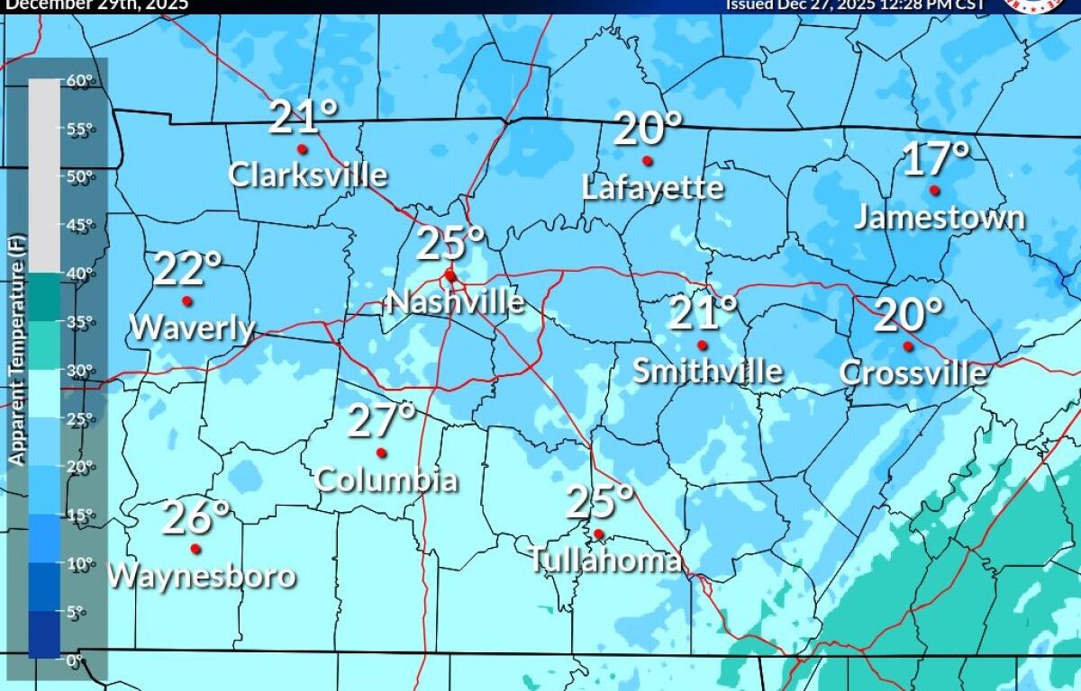 CLARKSVILLE, TN (CLARKSVILLE NOW) – Strong winds and storms are expected late today, followed by a sharp drop in temperatures overnight as a powerful cold front moves through the area. Gusty south winds and scattered showers will give way to thunderstorms this evening, with temperatures falling into the 20s by Monday morning, according to the National Weather Service.