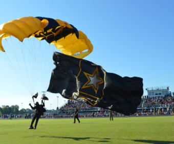 Students from West Creek, High, Middle and Elementary Schools joined together for the performance by the Golden Knights Army Parachute Team.