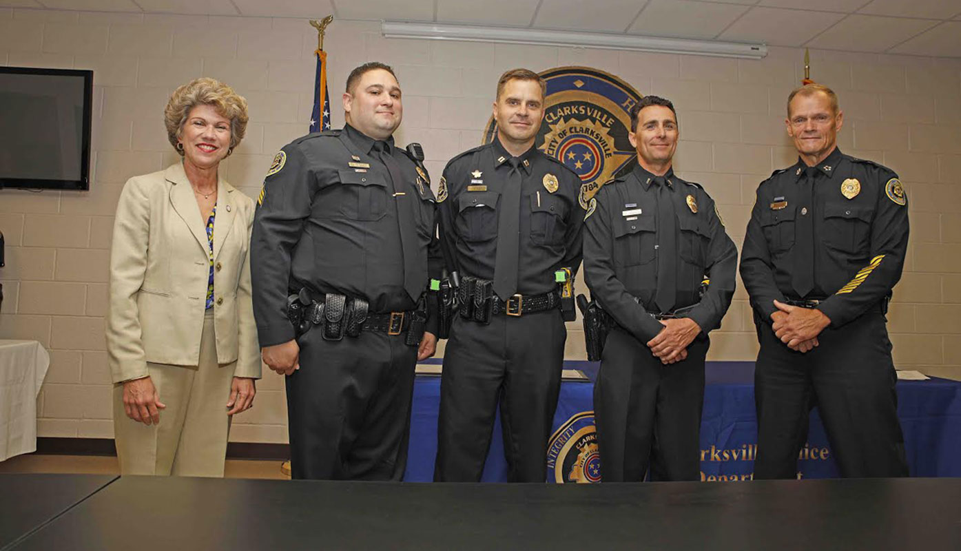 The three officers, Eric Ewing, Scott Hendrickson and Ty Burdine, were promoted Friday.