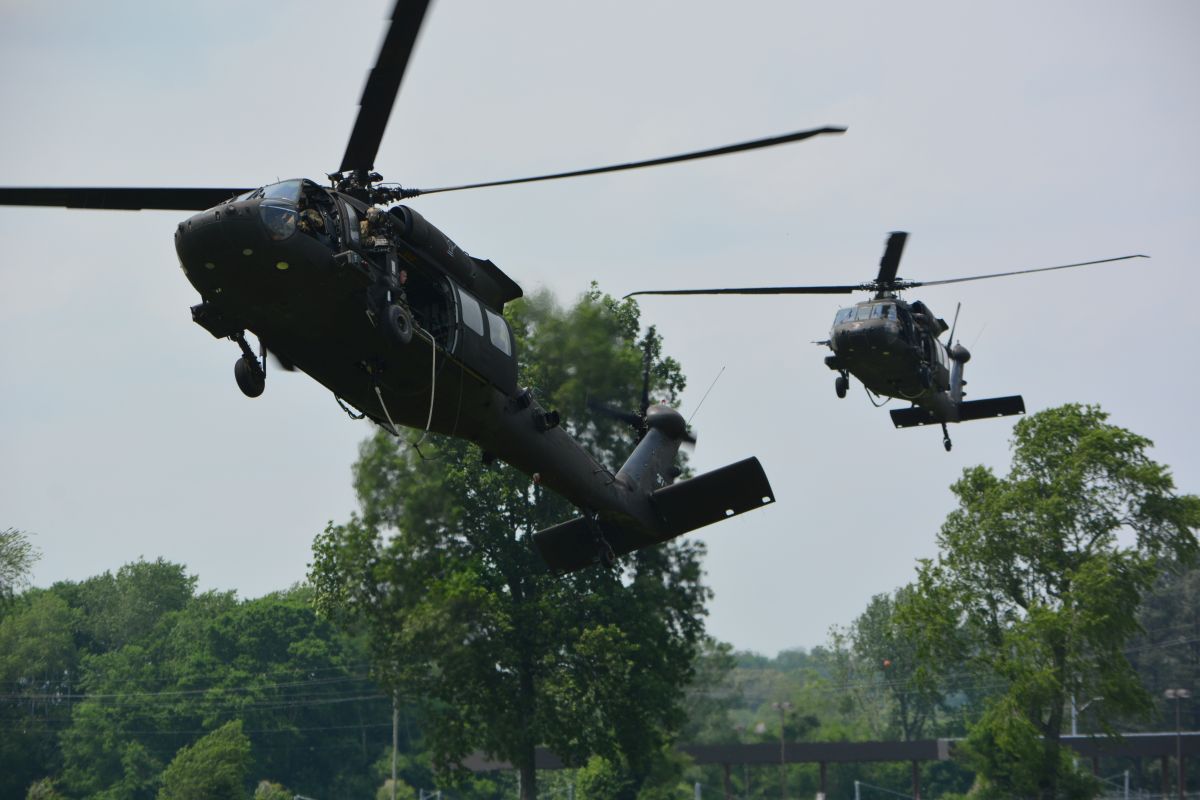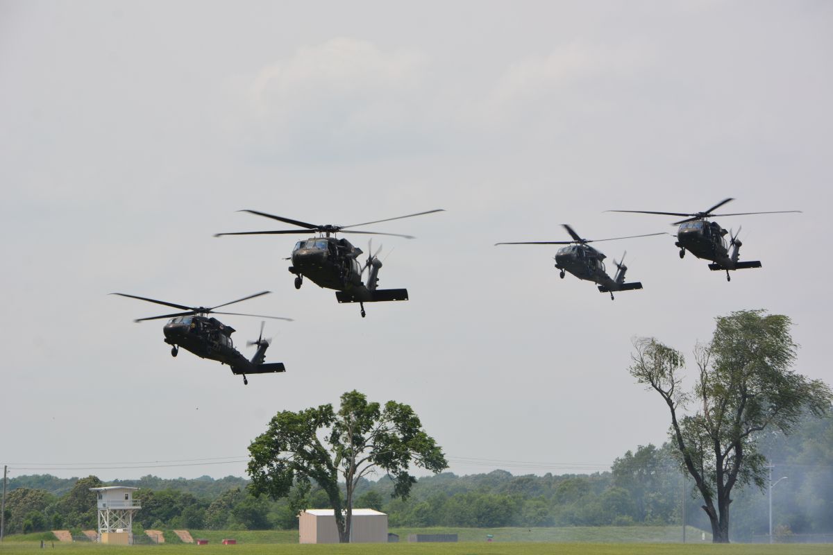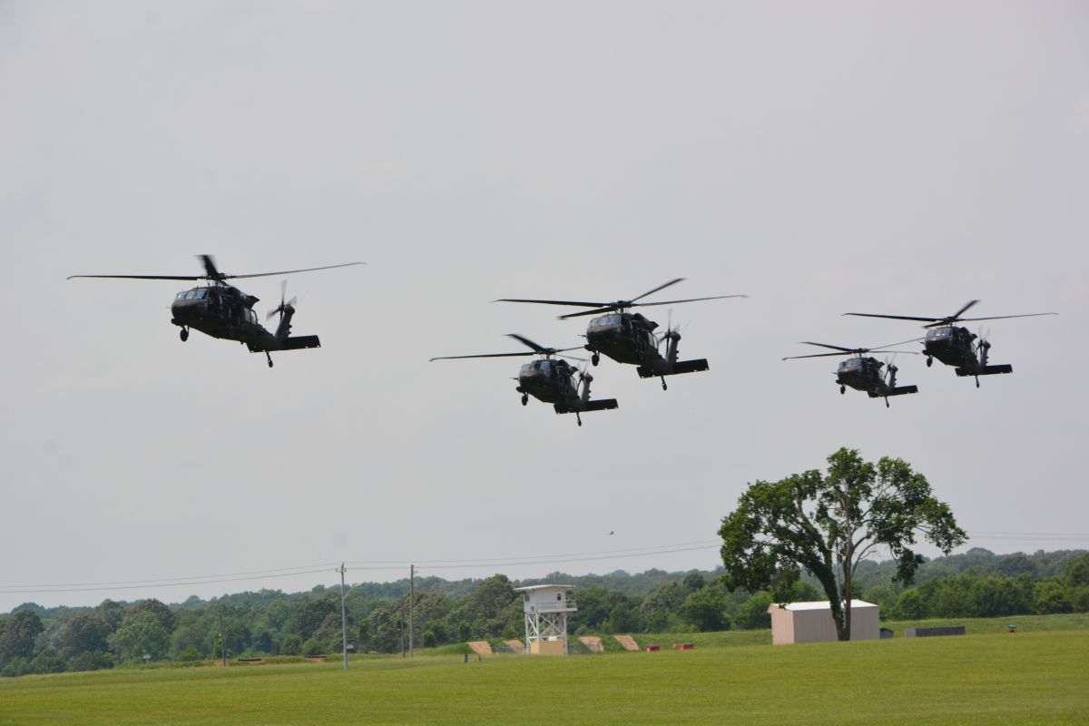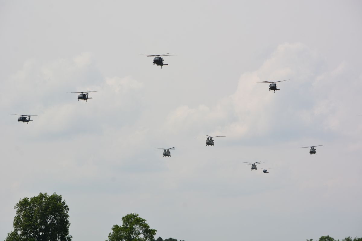 Helicopters fly over the Air Assault School on Fort Campbell as part of the Air Assault Demonstration during Week of the Eagles on May 21, 2022. (Lee Erwin)