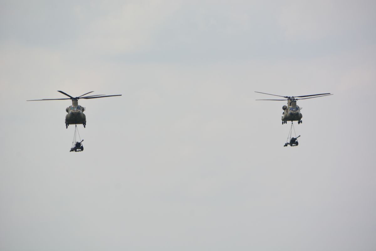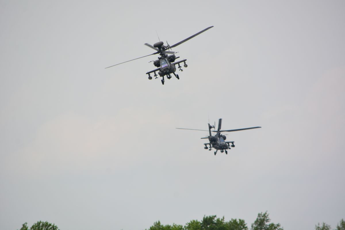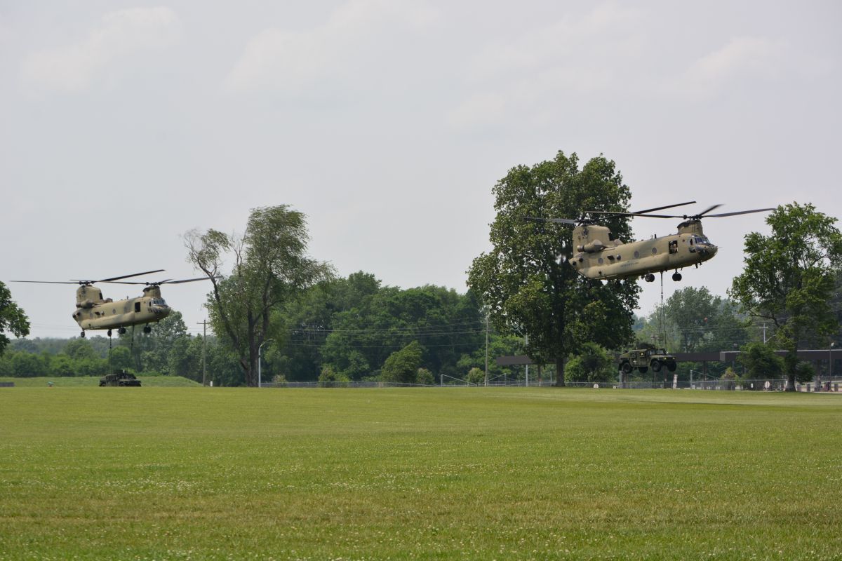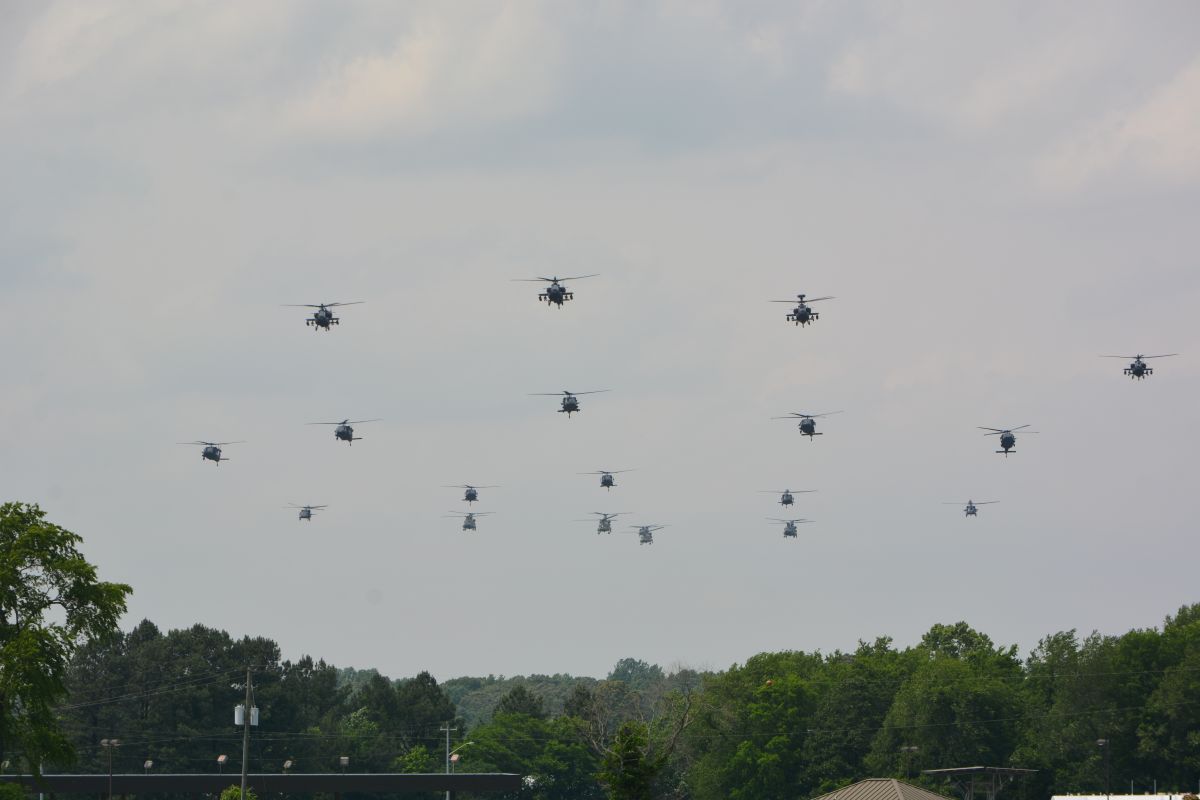 Helicopters fly over the Air Assault School on Fort Campbell as part of the Air Assault Demonstration during Week of the Eagles on May 21, 2022. (Lee Erwin)
