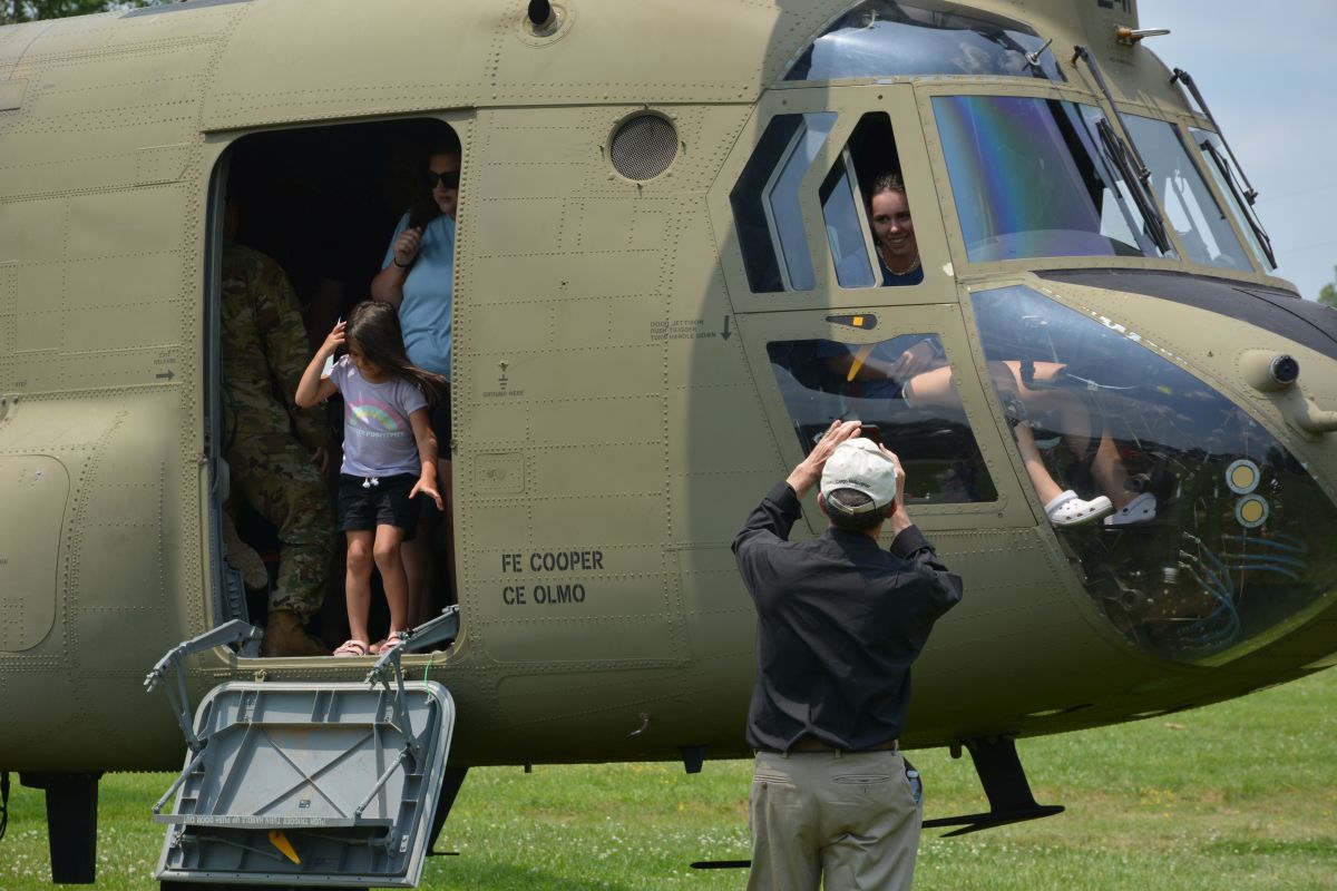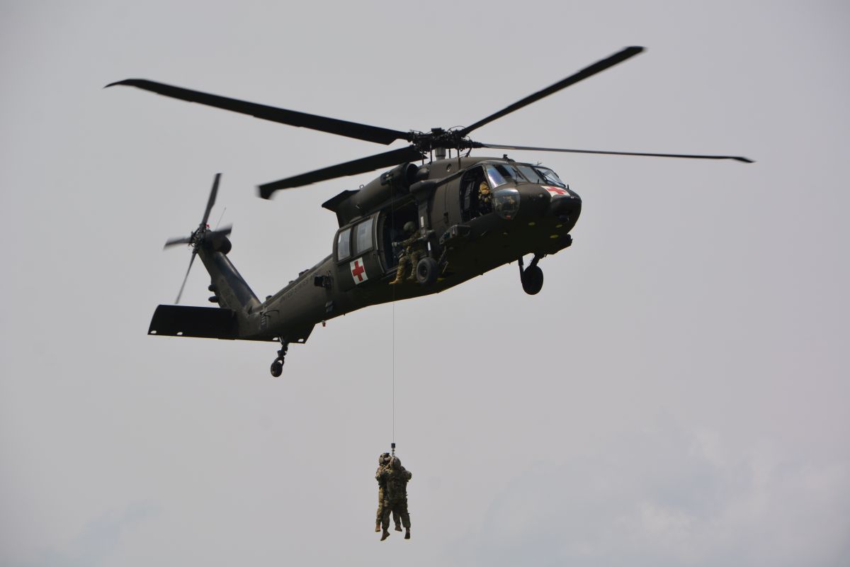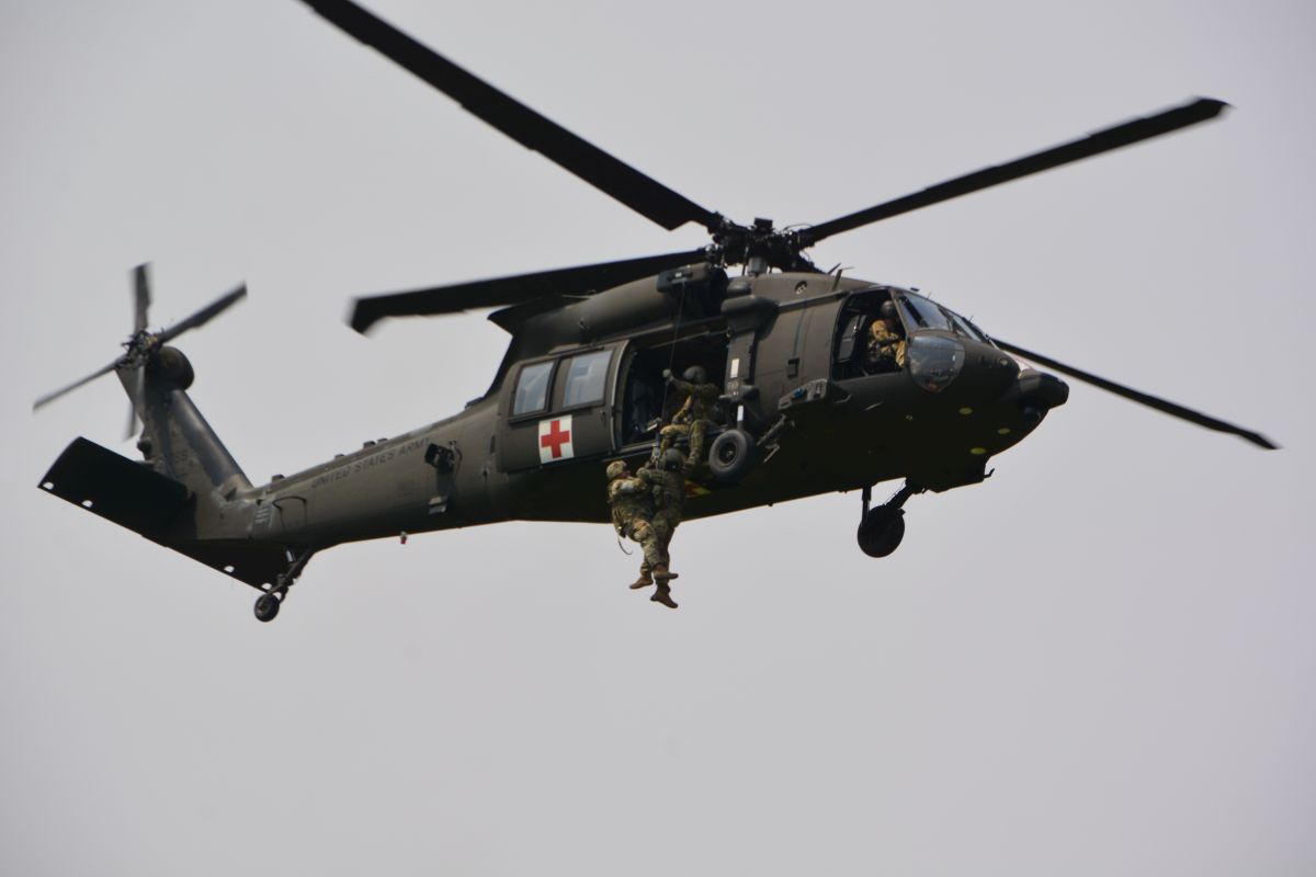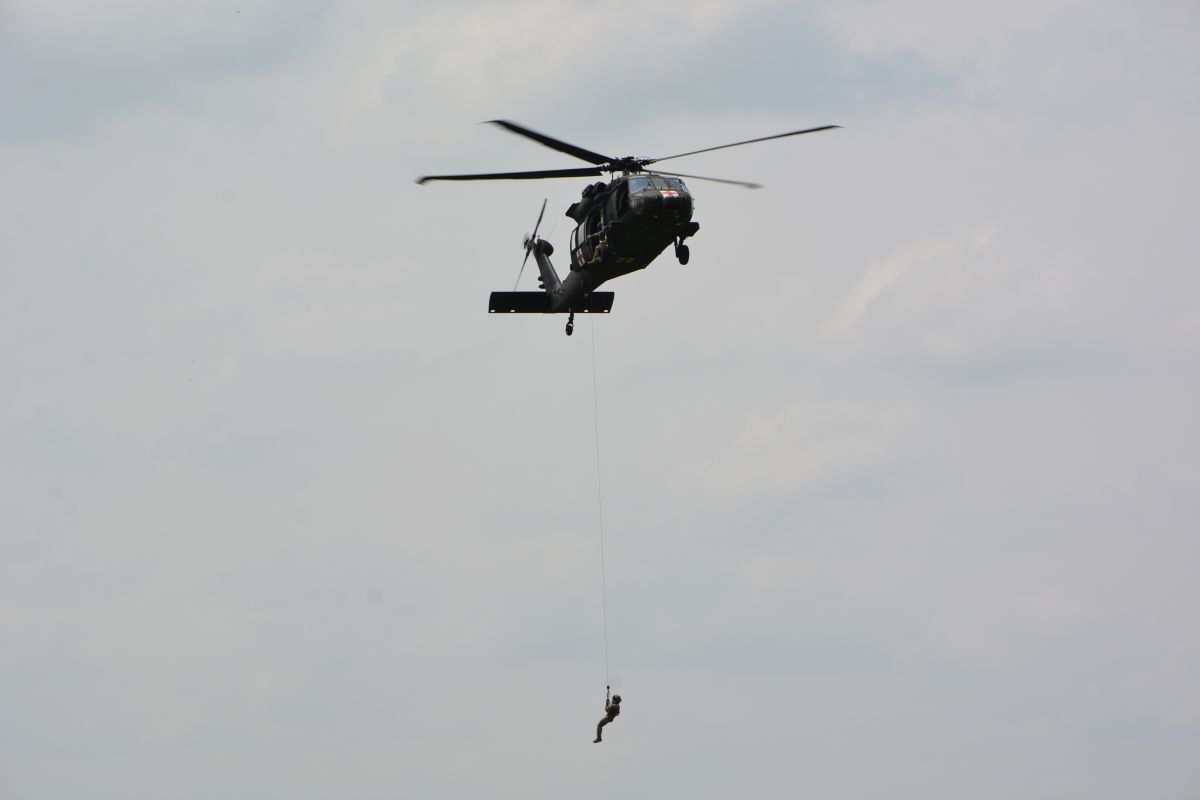 A Soldier is lifted into the air on Fort Campbell as part of the Air Assault Demonstration during Week of the Eagles on May 21, 2022. (Lee Erwin)