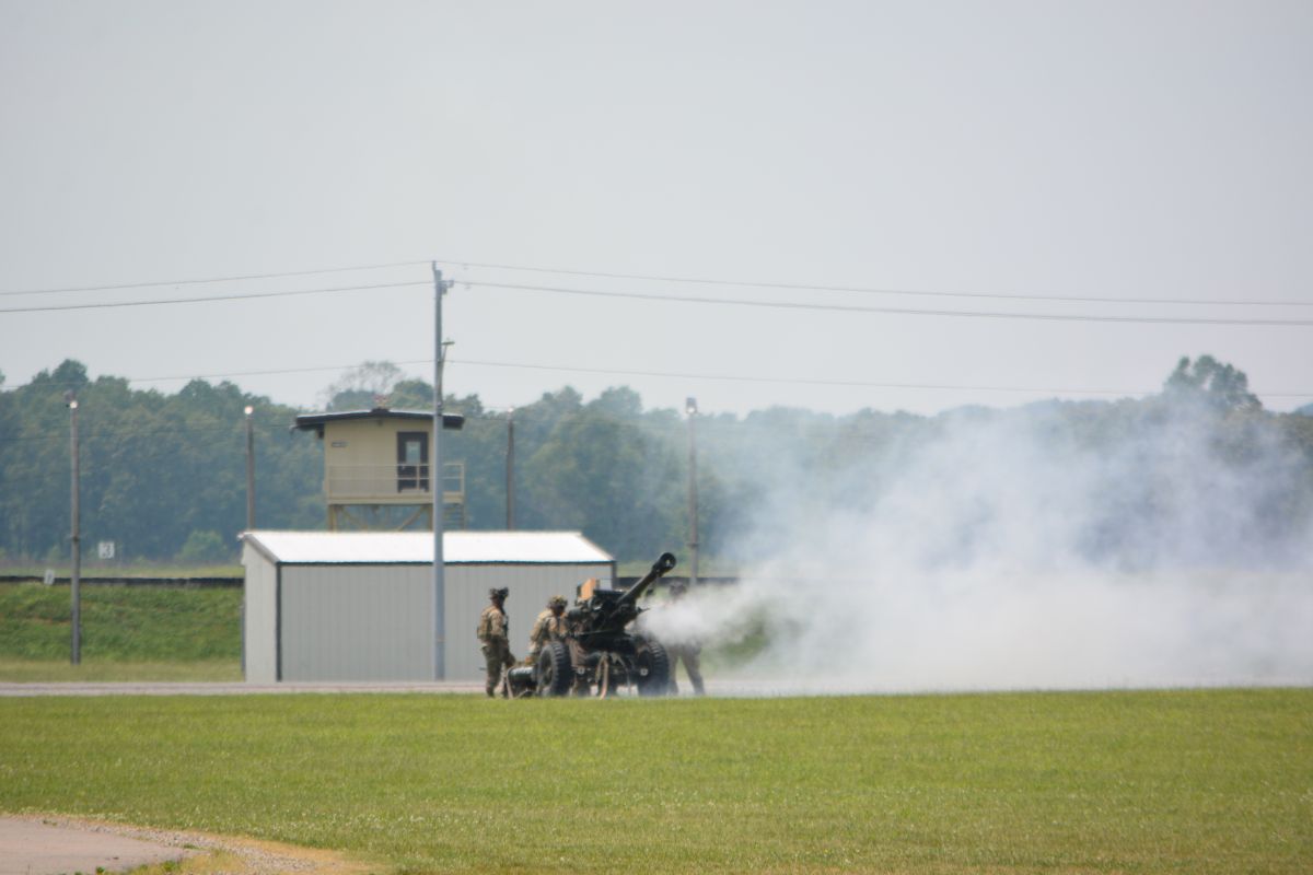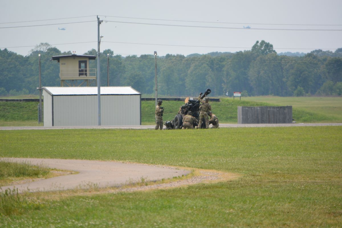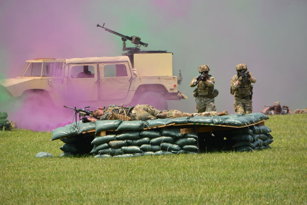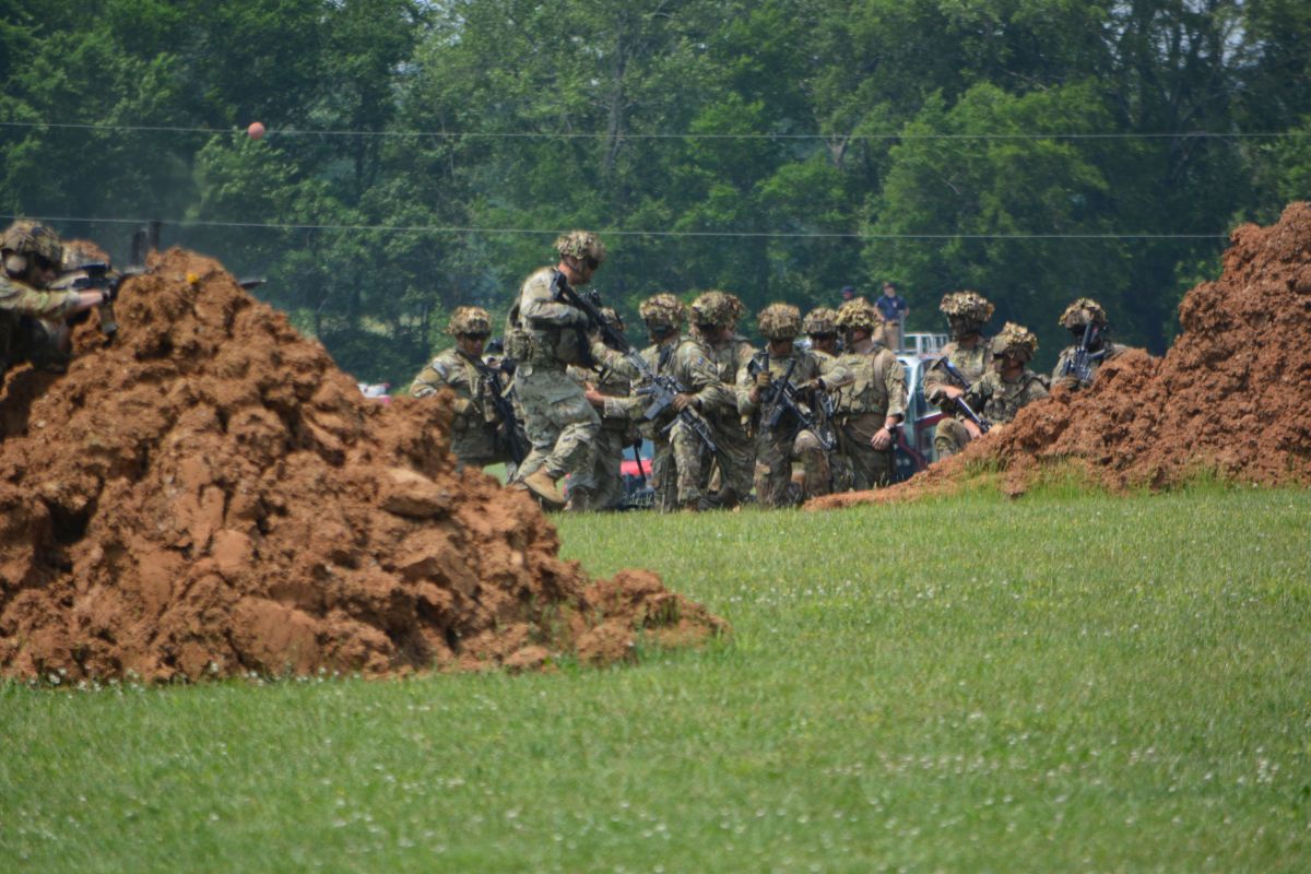 Soldiers participating in a mock battle with artillery on Fort Campbell as part of the Air Assault Demonstration during Week of the Eagles on May 21, 2022. (Lee Erwin)