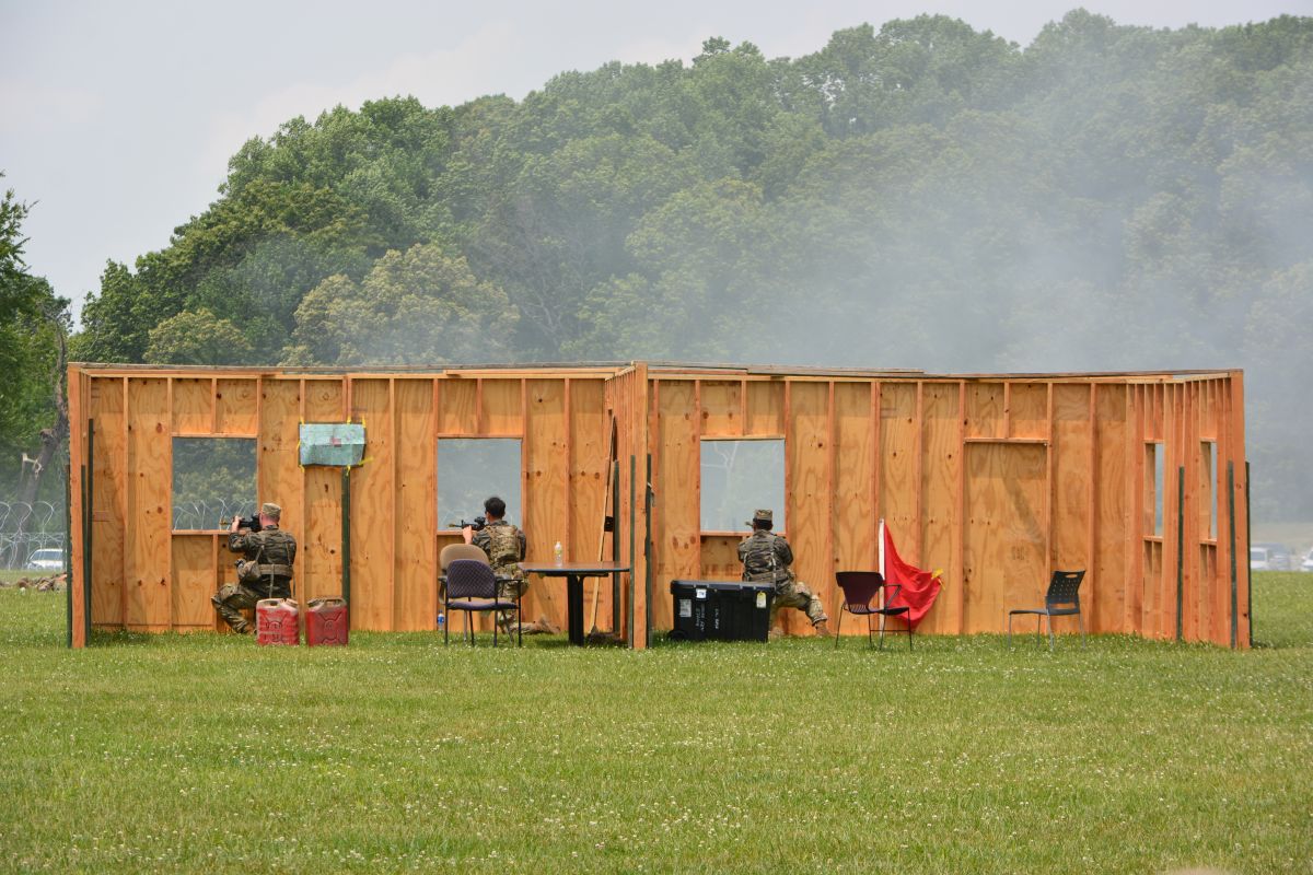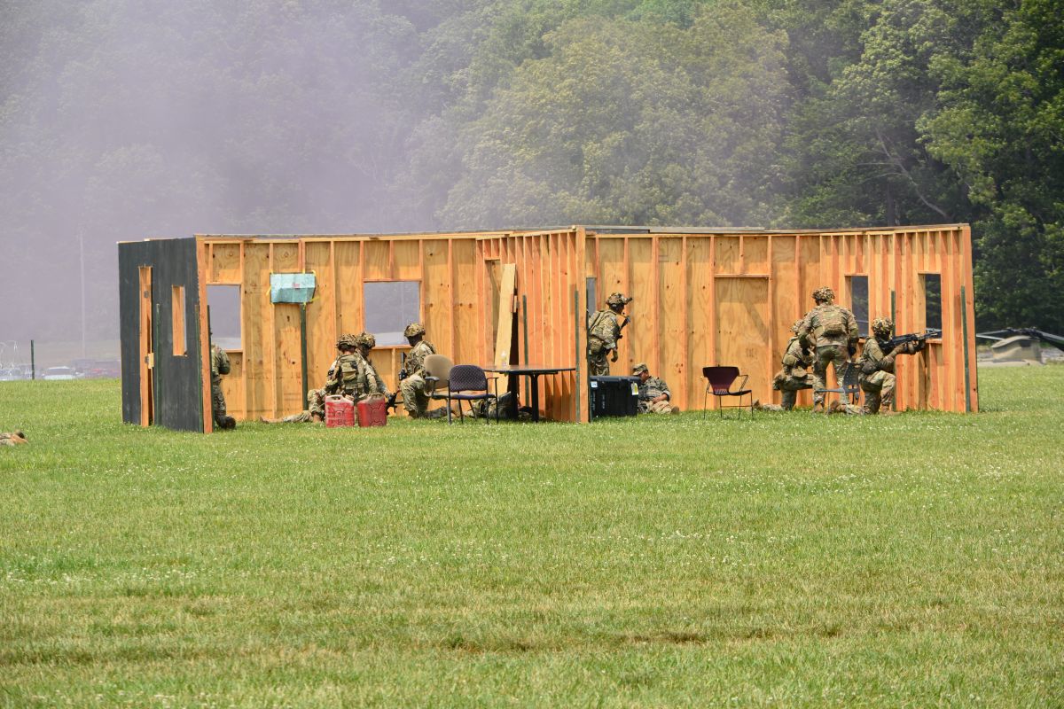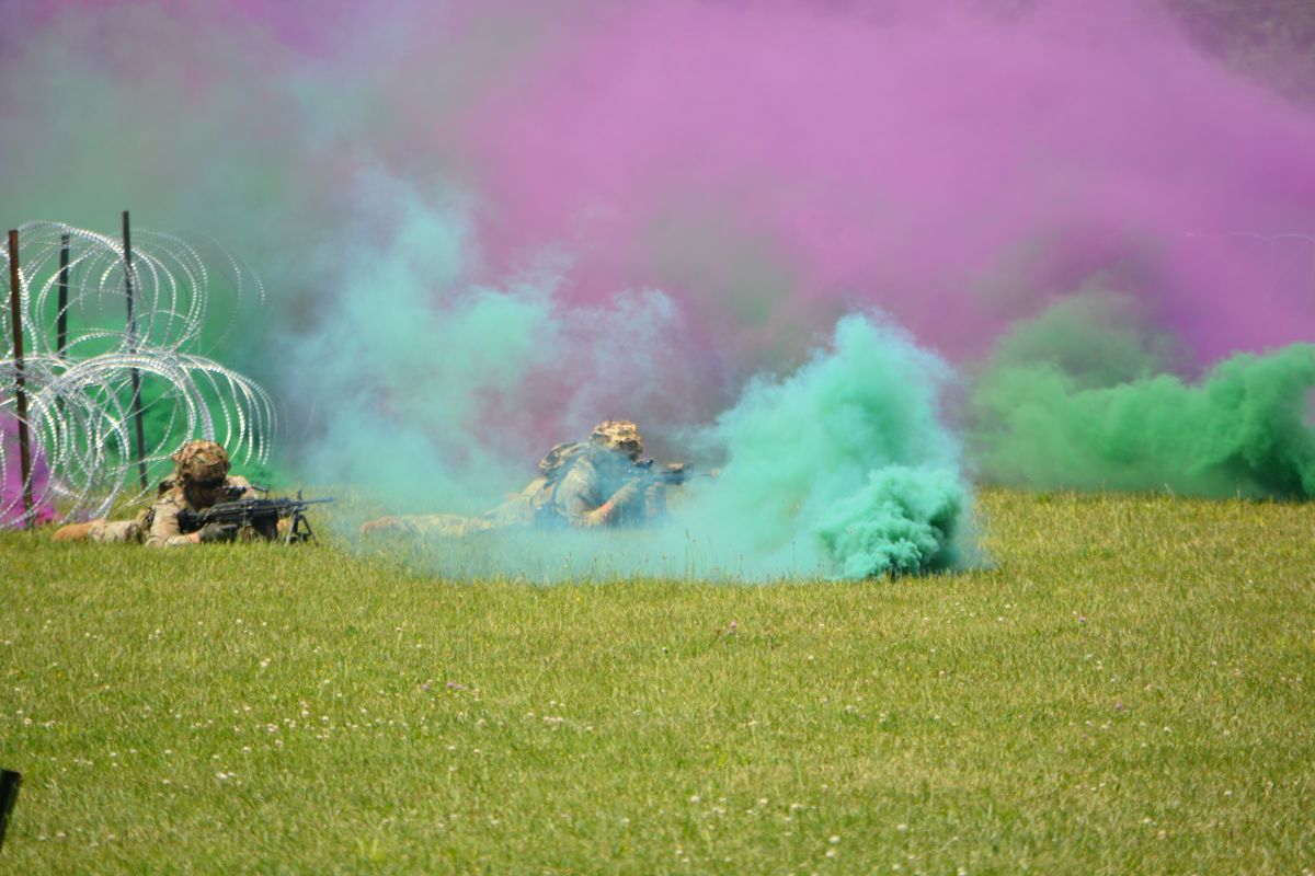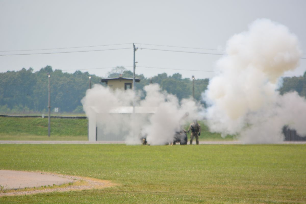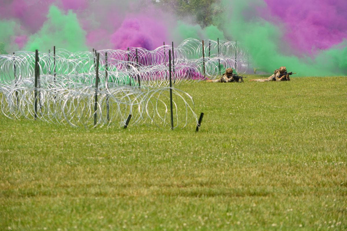 Soldiers participating in a mock battle with artillery on Fort Campbell as part of the Air Assault Demonstration during Week of the Eagles on May 21, 2022. (Lee Erwin)
