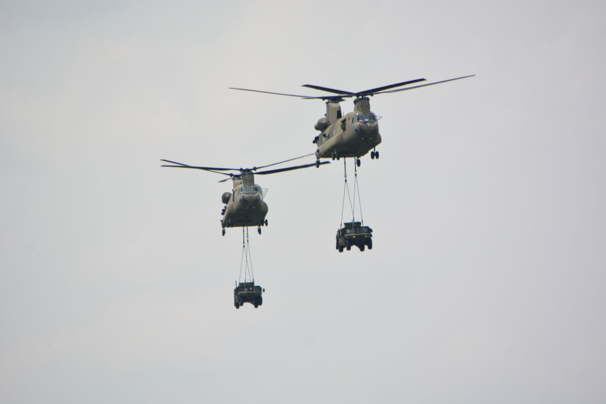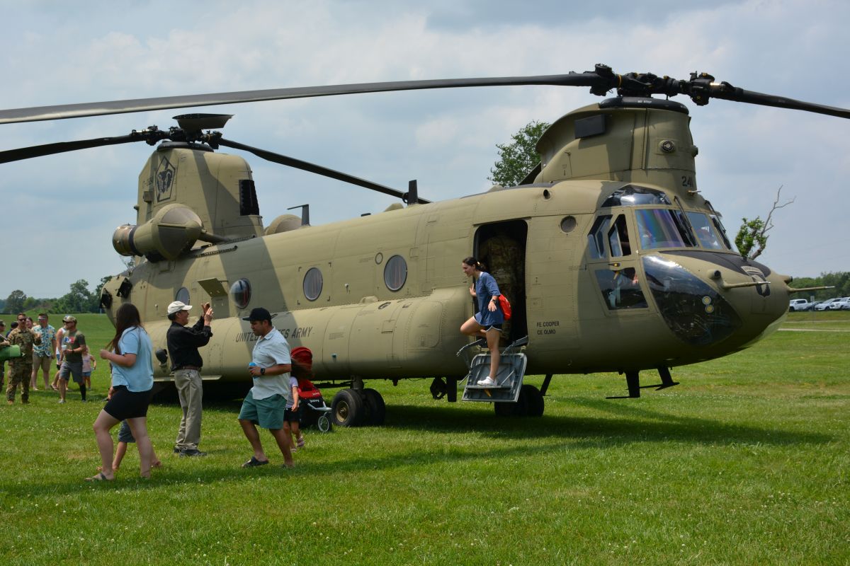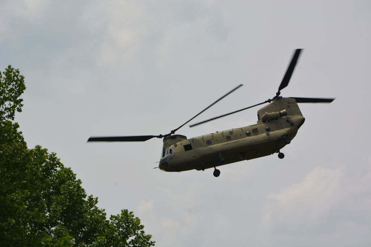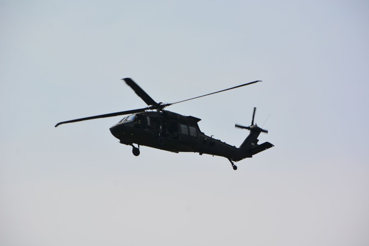 A Helicopter flies near the Air Assault School on Fort Campbell as part of the Air Assault Demonstration during Week of the Eagles on May 21, 2022. (Lee Erwin)