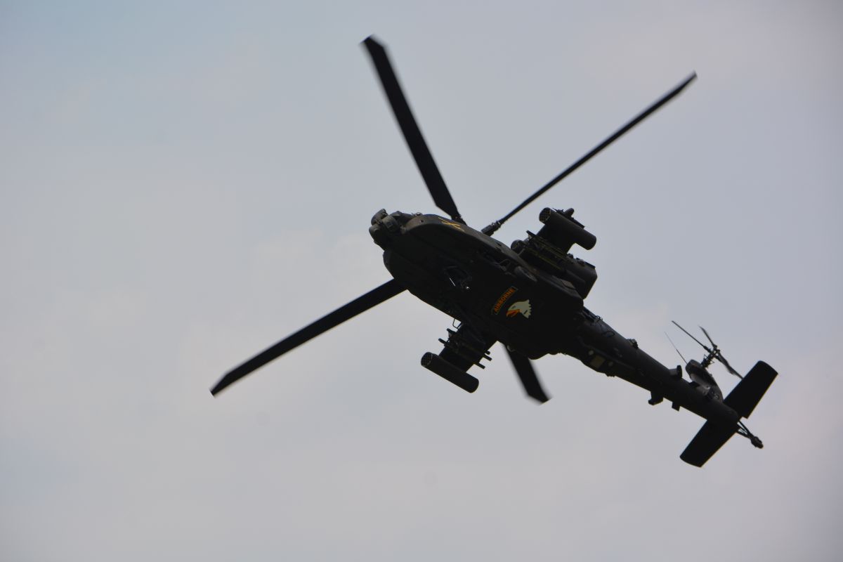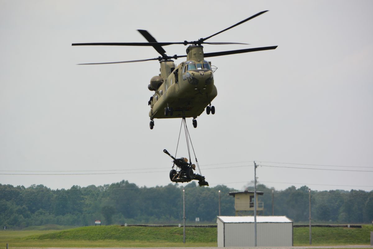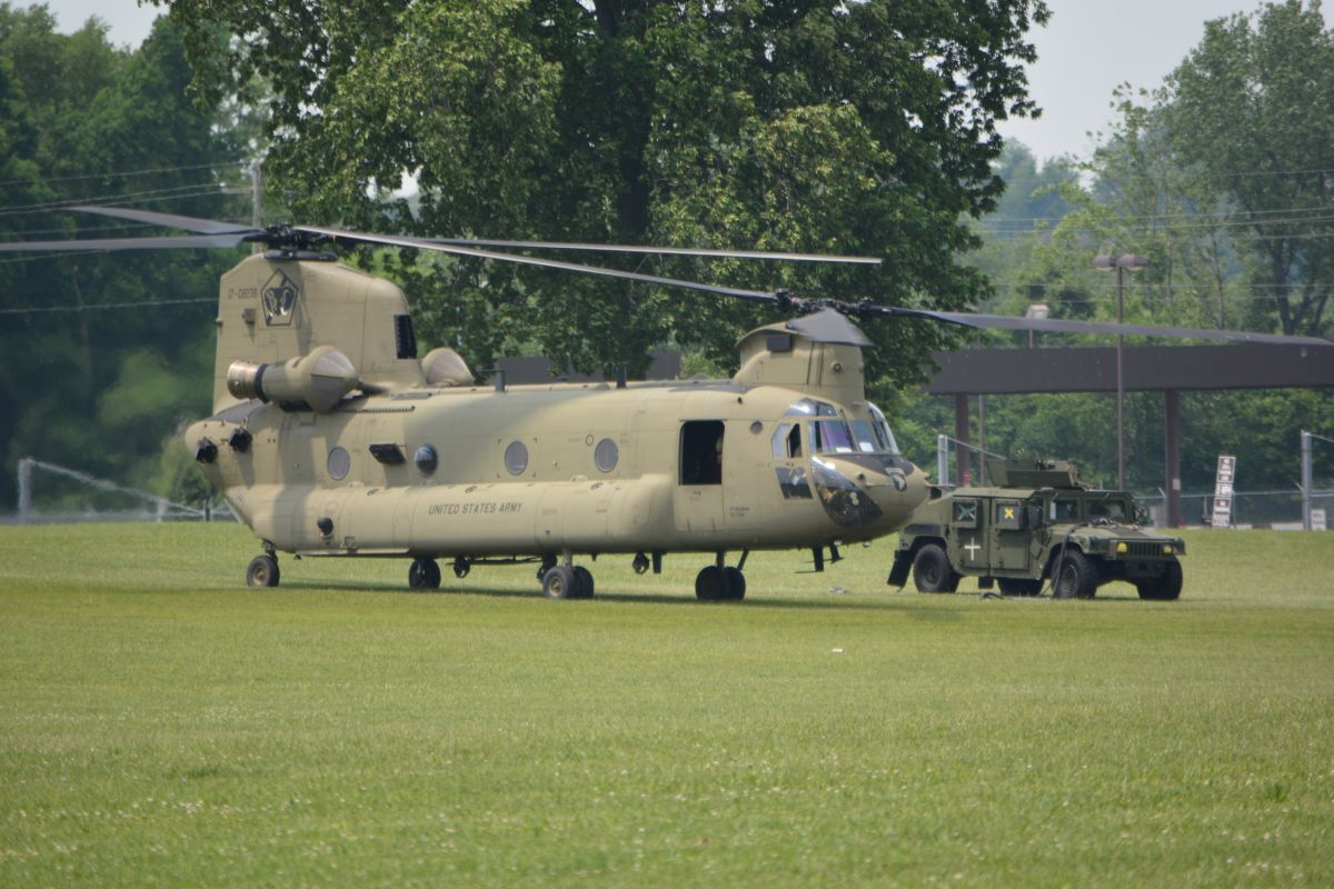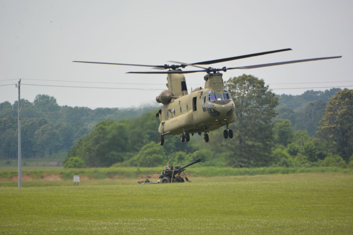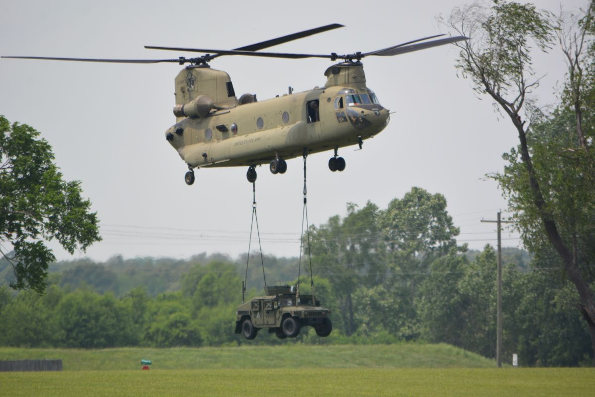 A Helicopter flies near the Air Assault School on Fort Campbell as part of the Air Assault Demonstration during Week of the Eagles on May 21, 2022. (Lee Erwin)