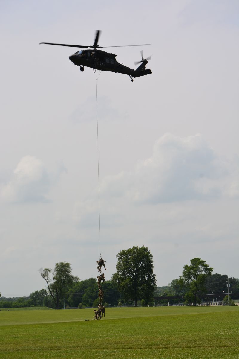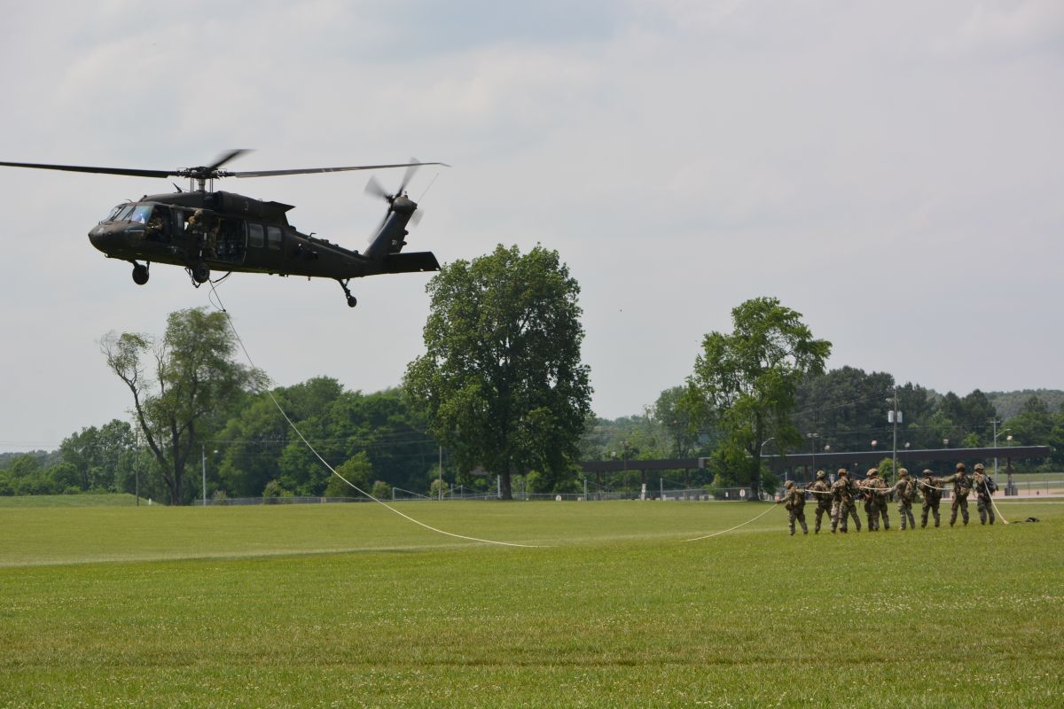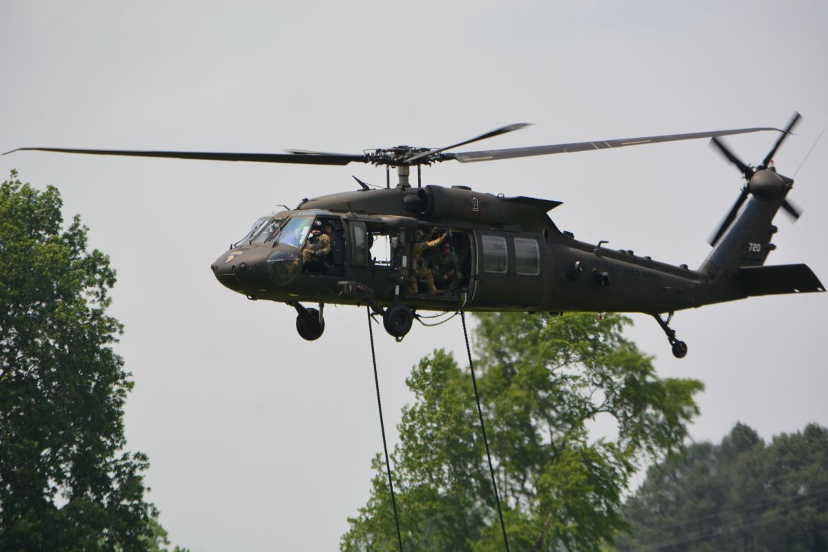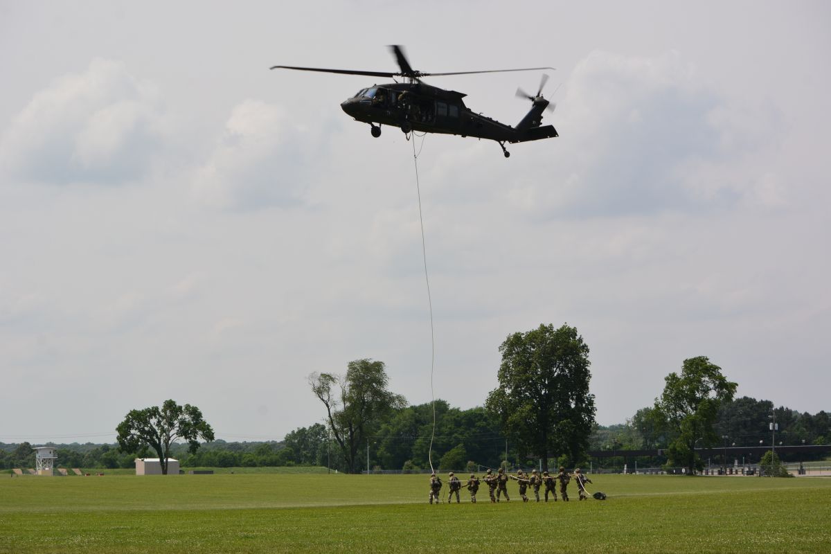 A Helicopter picks up soldiers over the Air Assault School on Fort Campbell as part of the Air Assault Demonstration during Week of the Eagles on May 21, 2022. (Lee Erwin)