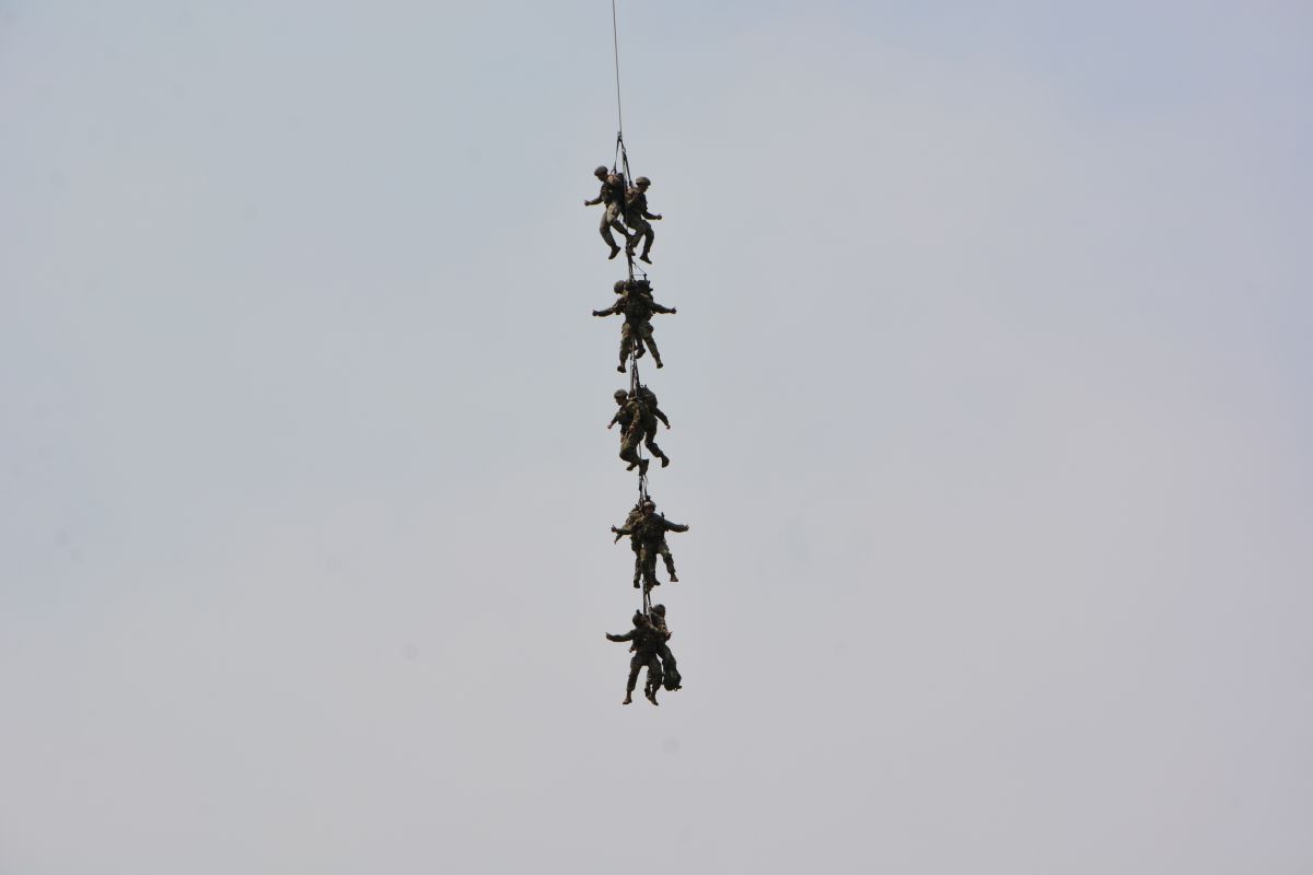 Soldiers are lifted into the air on Fort Campbell as part of the Air Assault Demonstration during Week of the Eagles on May 21, 2022. (Lee Erwin)