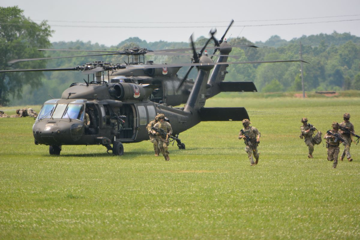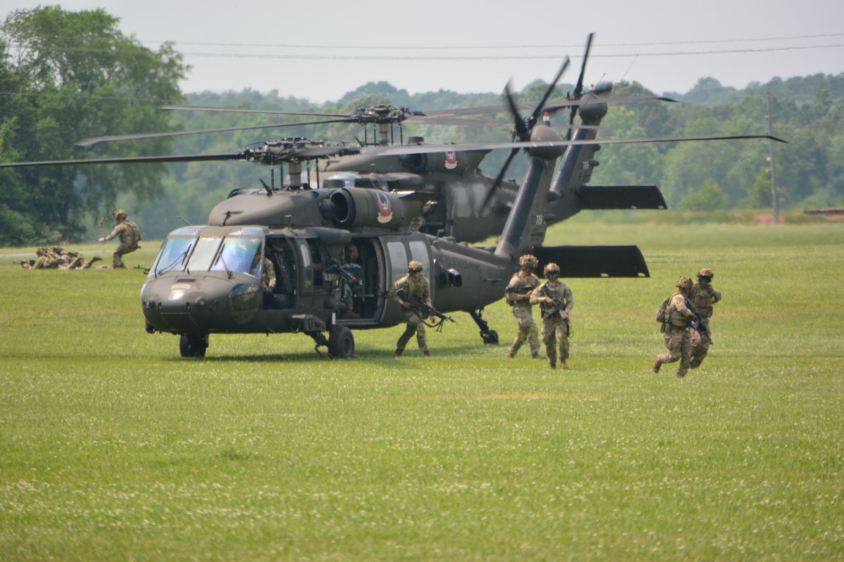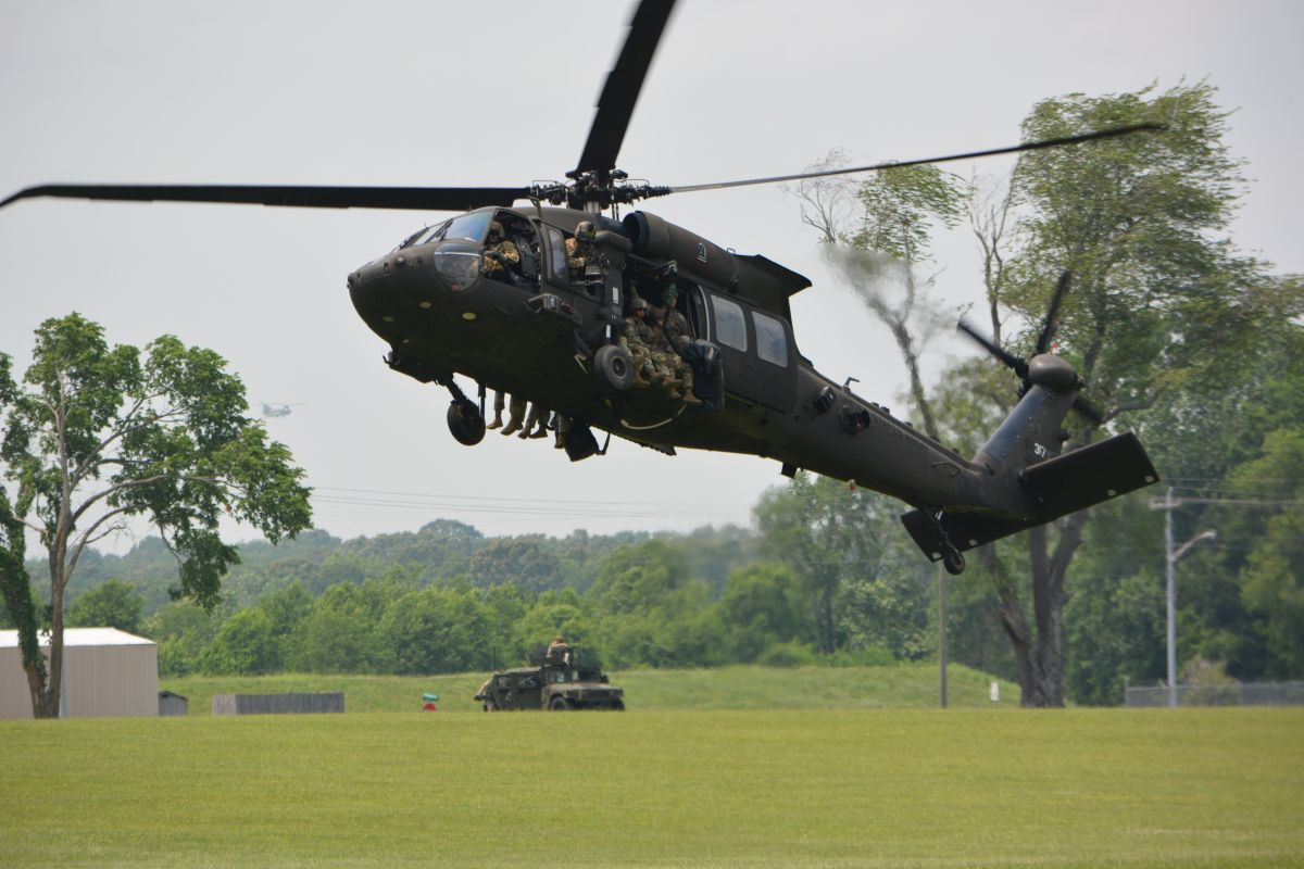 A Helicopter lands at the Air Assault School on Fort Campbell as part of the Air Assault Demonstration during Week of the Eagles on May 21, 2022. (Lee Erwin)