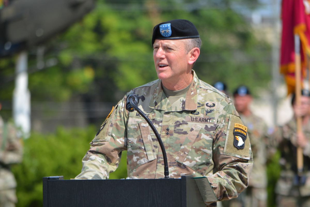 Commander of the 101st Airborne Division (Air Assault), Major General JP McGee, speaking at the Colors Casing Ceremony in preparation for deployment to Europe on, July 5, 2022. (Lee Erwin)