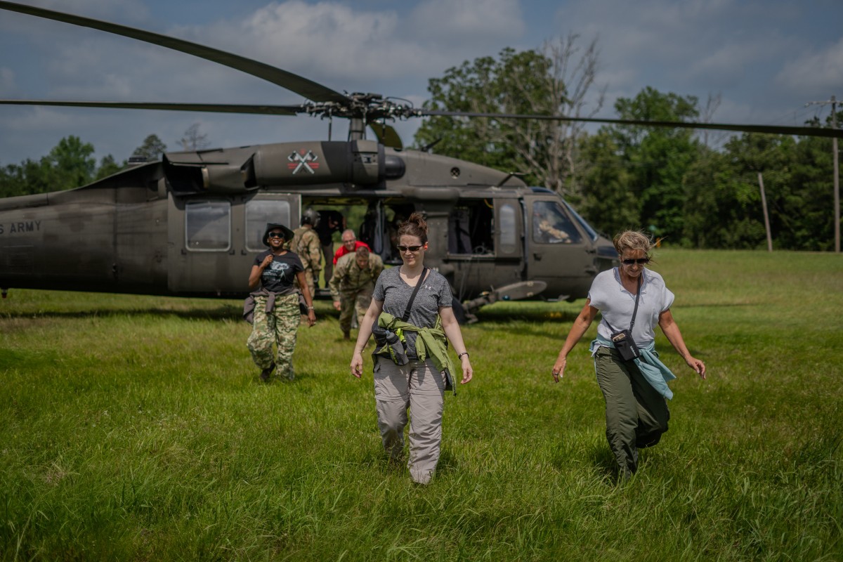 On Friday, the group boarded a CH-47 Chinook helicopter southbound to JRTC. Upon arrival, they witnessed the 1st Mobile Brigade Combat Team “Bastogne” from the 101st Airborne Division conduct their JRTC rotation, which is a culminating training exercise for many Army units.