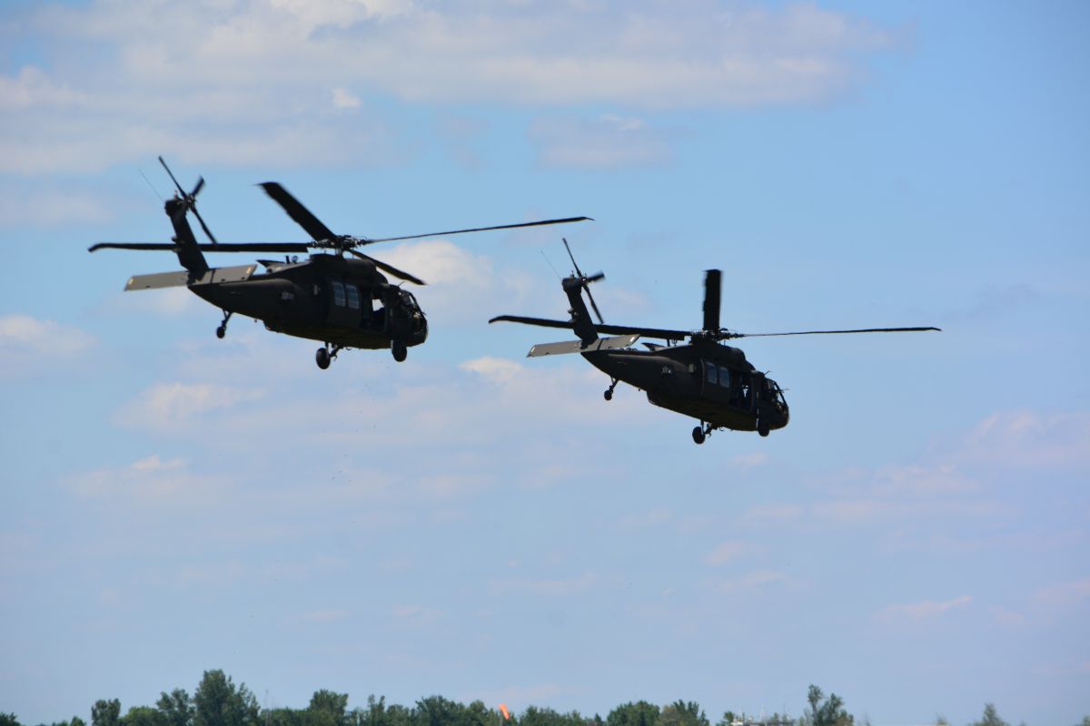 Two Black Hawk helicopters participate in the Air Assault Demonstration at Fort Campbell’s Week of the Eagles on Tue June 22 2021 (Lee Erwin).