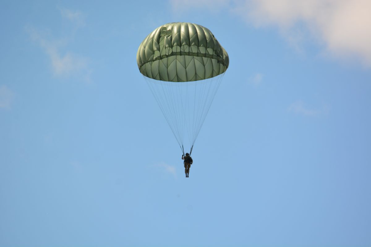 The action began with the Liberty Jump Team parachuting out of a vintage C-47 aircraft outfitted with uniforms and using parachutes much like those used by the 101st in World War II.                 The team consists of former and current members of the military.