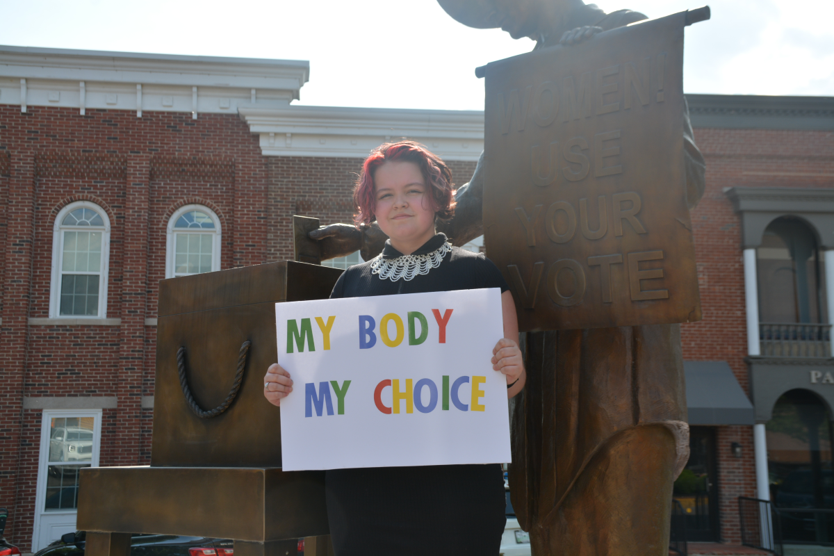 Kassandra Dellinger holding a sign to protest overturning Roe v. Wade in front of City Hall on Friday, May 13, 2022. (Angela Peterson)
