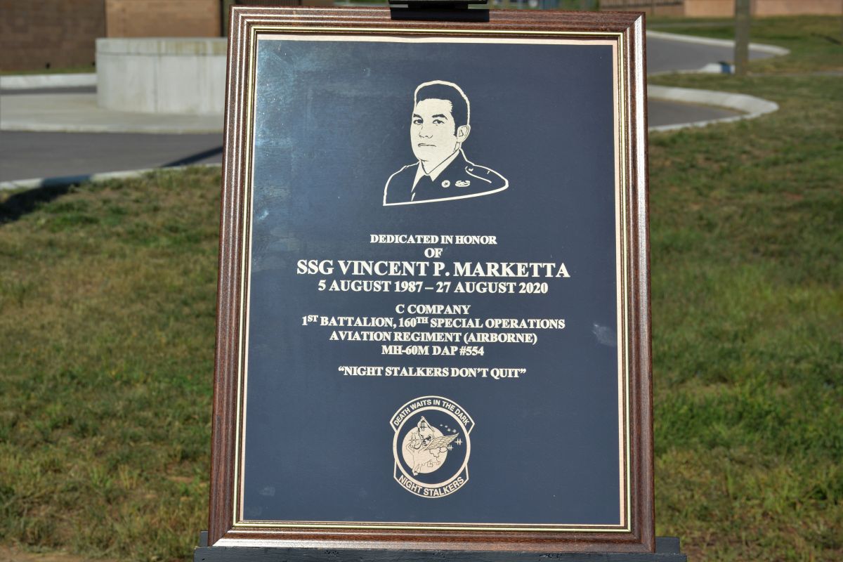 A plaque for Staff Sergeant Vincent P. Marketta at the dedication of the Marketta-Shelton Military Operations in Urban Terrain (MOUT) training site at Fort Campbell, KY. Named in honor of fallen 160th SOAR Night Stalkers, Staff Sergeant Vincent P. Marketta and Sergeant Tyler M. Shelton on, Aug 26, 2022 (Lee Erwin)