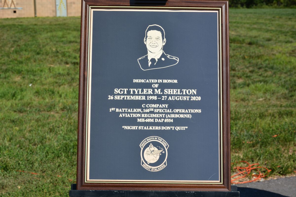 A plaque for Sergeant Tyler M. Shelton at the dedication of the Marketta-Shelton Military Operations in Urban Terrain (MOUT) training site at Fort Campbell, KY. Named in honor of fallen 160th SOAR Night Stalkers, Staff Sergeant Vincent P. Marketta and Sergeant Tyler M. Shelton on, Aug 26, 2022 (Lee Erwin)