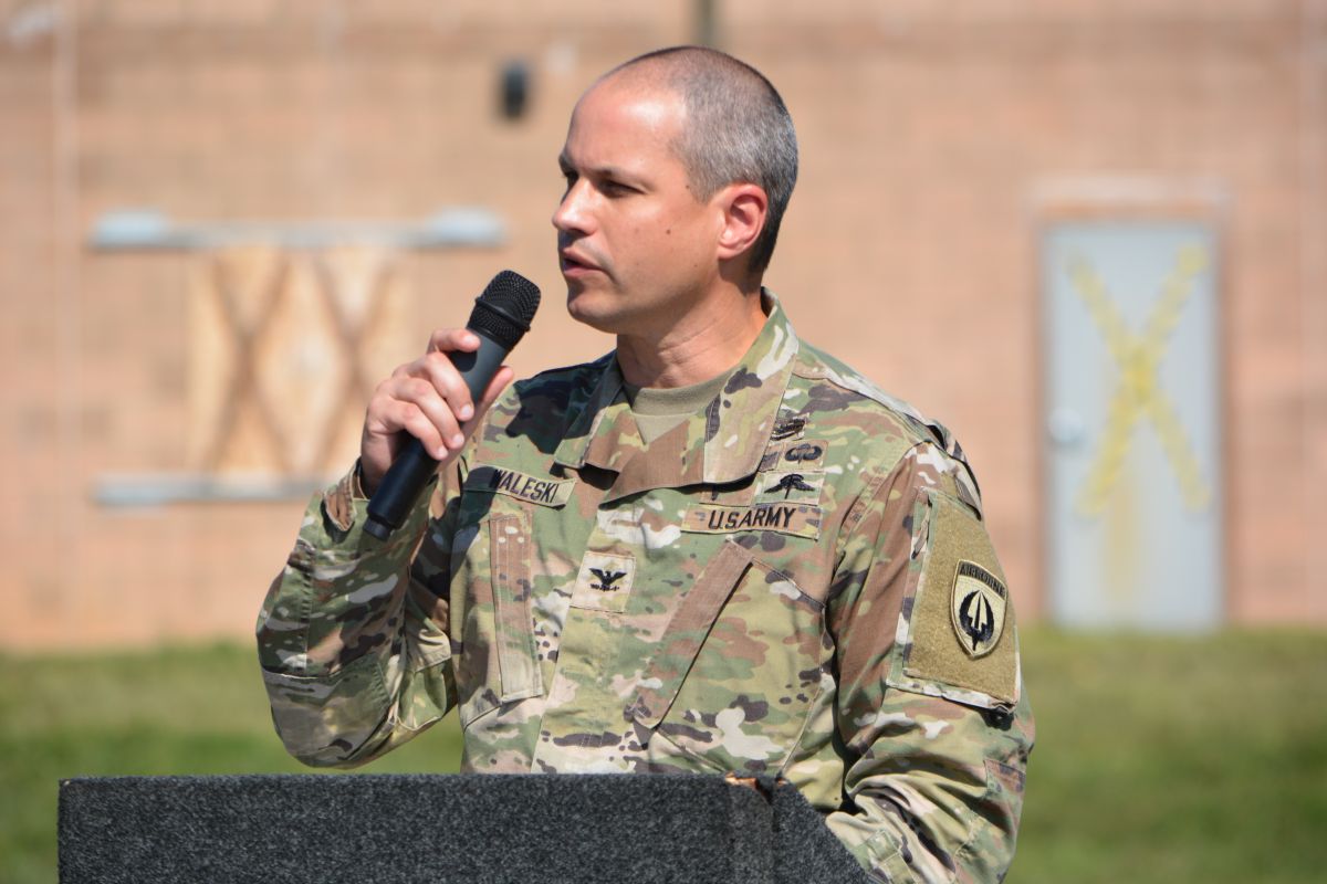 Colonel Roger Waleski speaking at the Marketta-Shelton Military Operations in Urban Terrain (MOUT) training site at Fort Campbell, KY. Named in honor of fallen 160th SOAR Night Stalkers, Staff Sergeant Vincent P. Marketta and Sergeant Tyler M. Shelton on, Aug 26, 2022 (Lee Erwin)