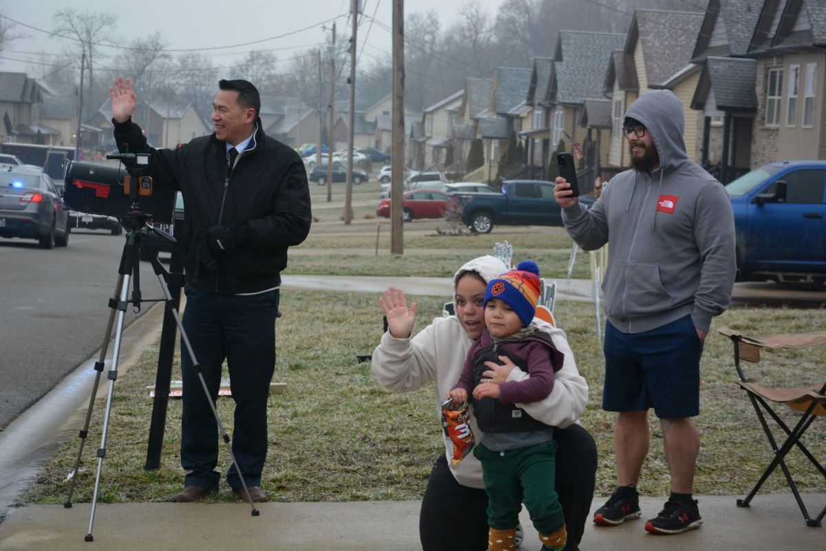Montgomery County Sheriff’s Deputy Sgt. Bishop Delaney, and the Ruiz family, Brinna, Grayson and Nathan, watch the Clarksville & Montgomery County First Responders drive-through for 3-year-old Grayson on Jan 31, 2023. (Lee Erwin)