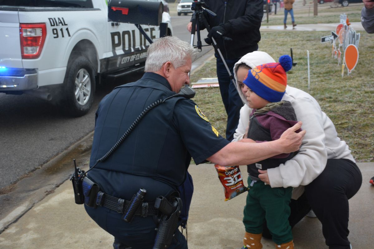 Clarksville Police greet Grayson Ruiz after his drive-through by Clarksville-Montgomery County First Responders on Jan 31, 2023. (Lee Erwin)