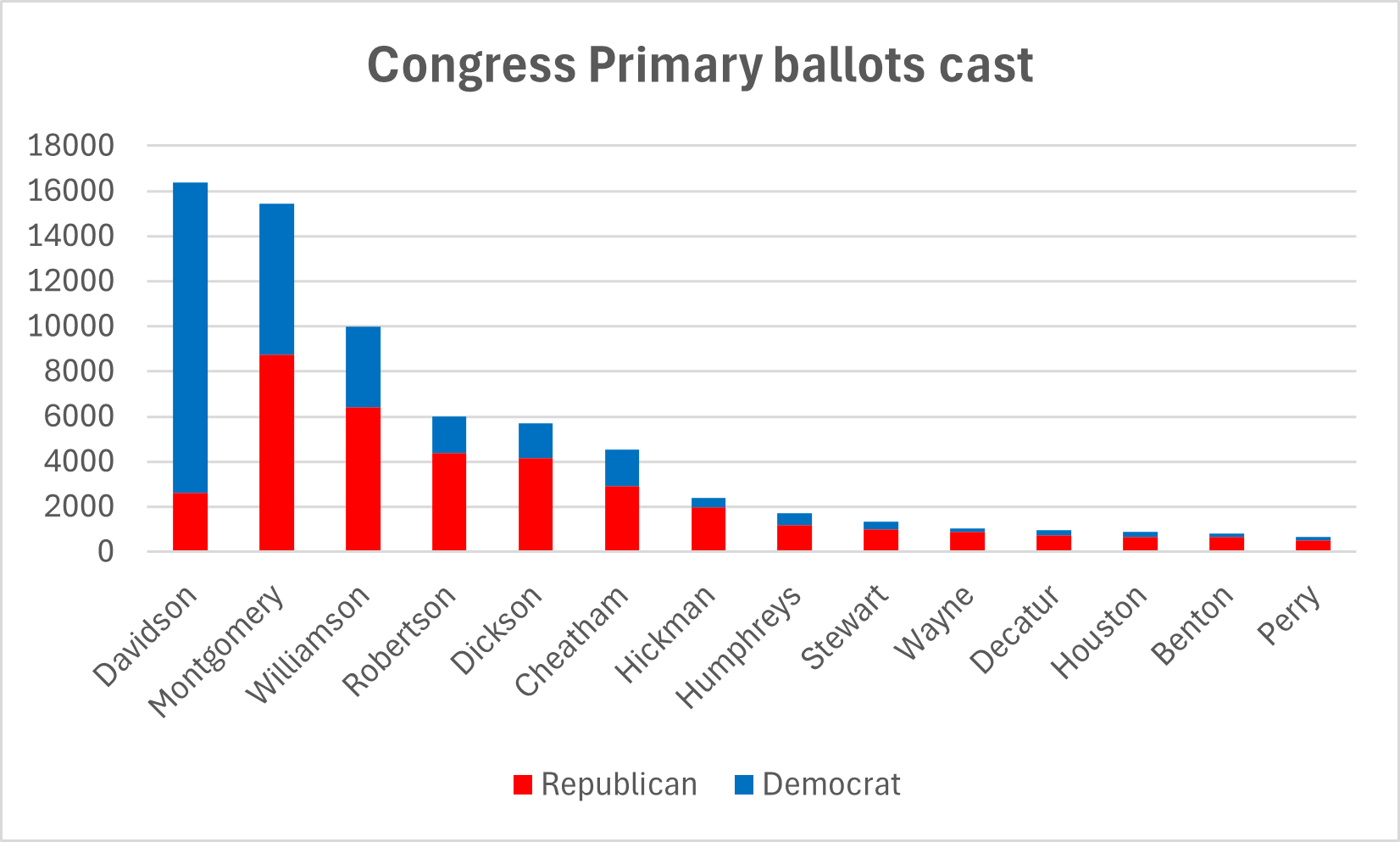 By party, though, Montgomery is far more important to Republicans. We had the most Republican ballots with 8,700, followed by Williamson at 6,400. Of the 14 counties in the district, Davidson had the 6th most Republican ballots, with only 2,600.