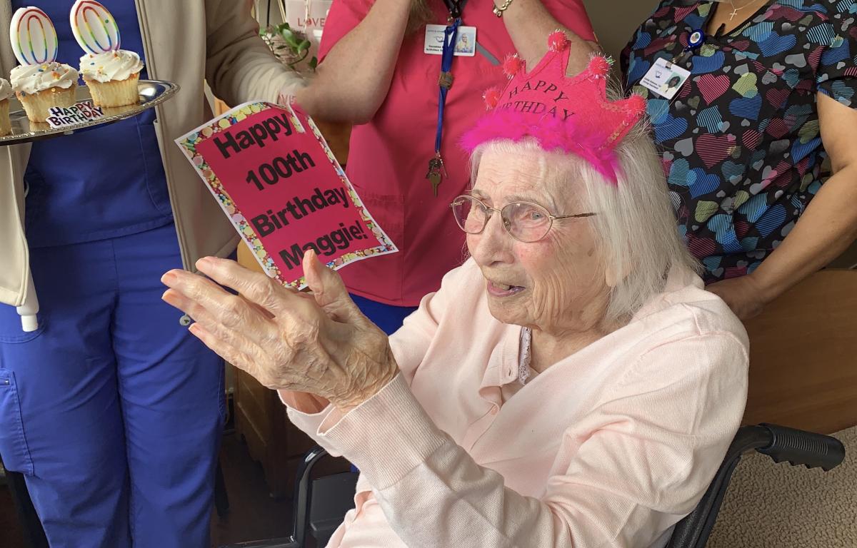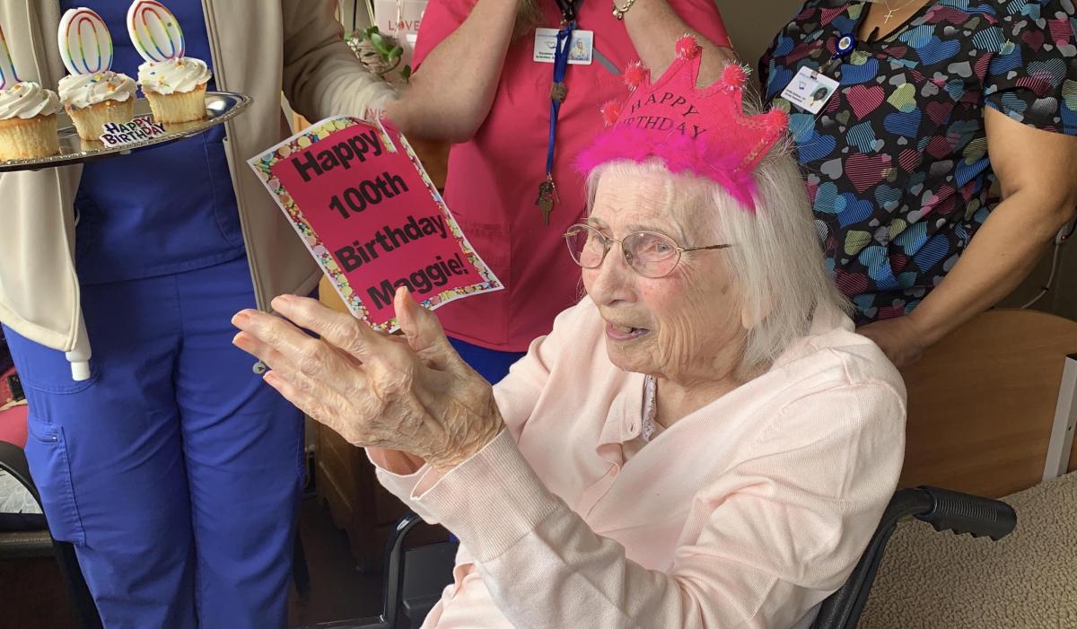 Maggie was happy and surprised to see her family and friends at her window to help celebrate such an amazing milestone, according to Ahava staff.