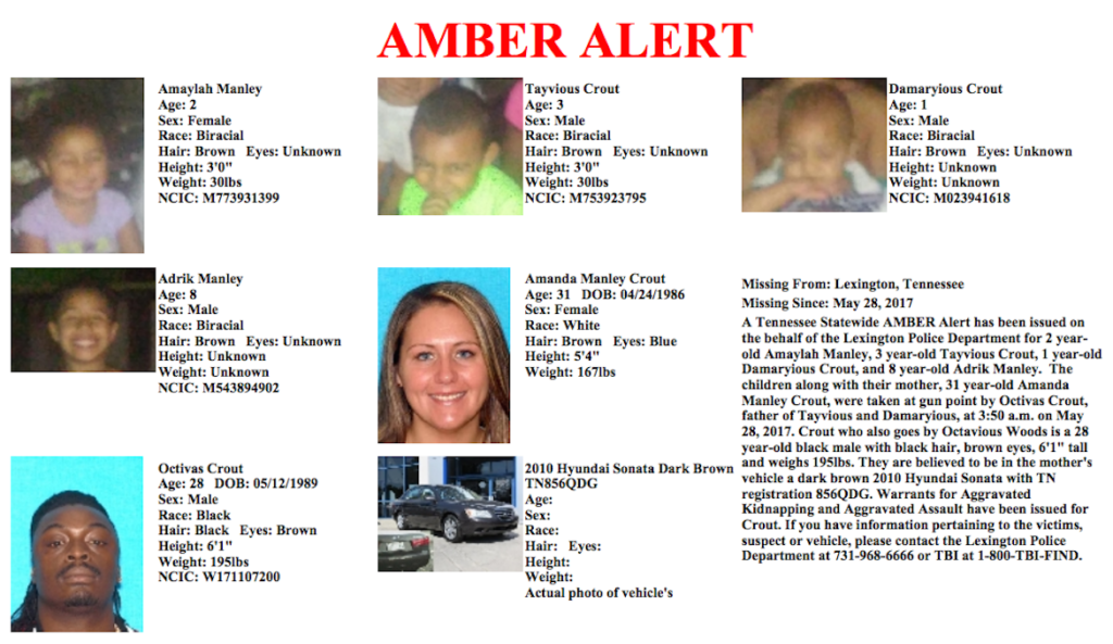 The Tennessee Bureau of Investigation says 1-year-old Damaryious Crout, 3-year-old Tayvious Crout, 2-year-old Amaylah Manley and 8-year-old Adrik Manley were taken early Sunday in Lexington, Tennessee, along with their mother, 31-year-old Amanda Manley Crout.