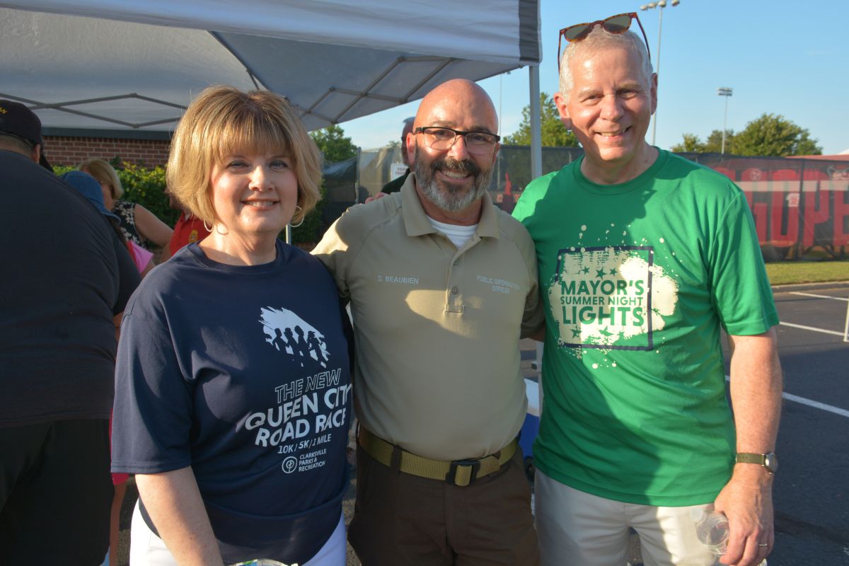 Cynthia Pitts, Scott Beaubien, and Clarksville Mayor Joe Pitts at National Night Out in Clarksville-Montgomery County at Austin Peay State University on Aug. 1, 2023. (Lee Erwin)