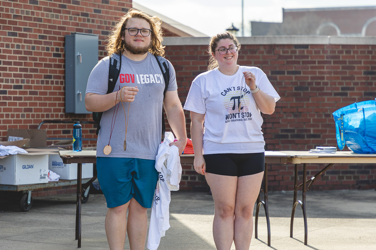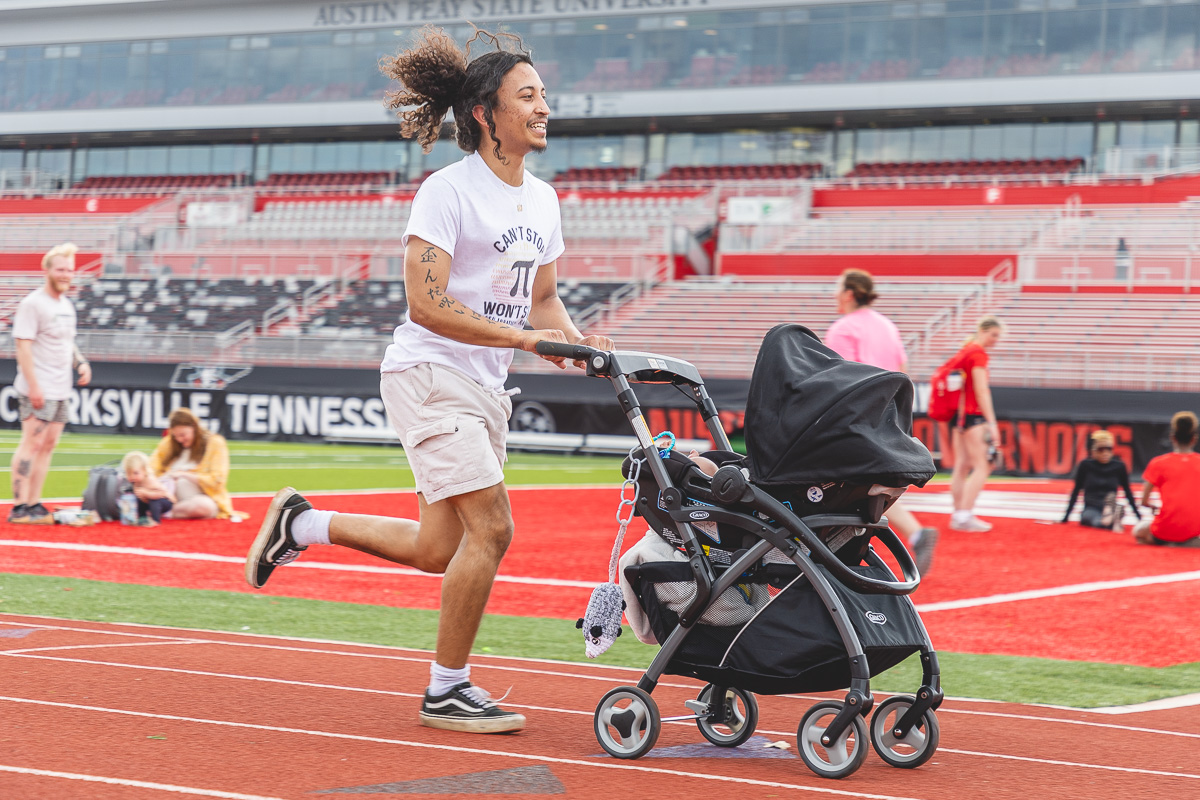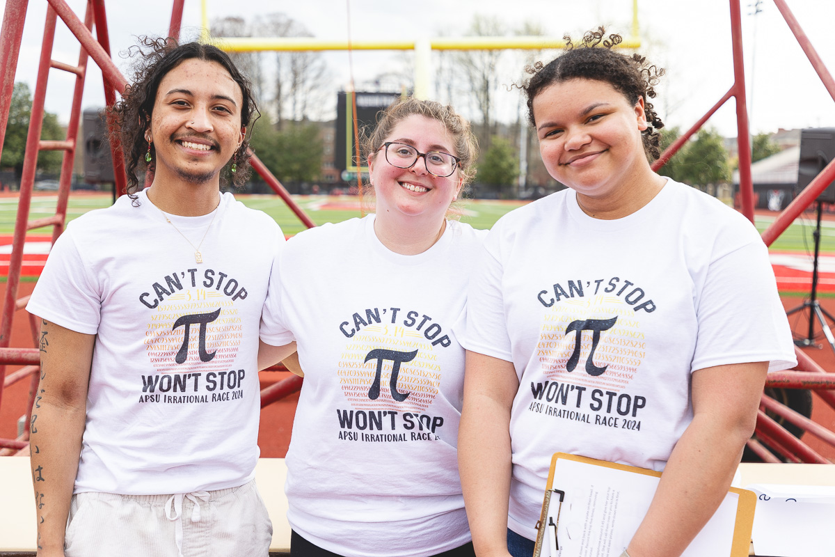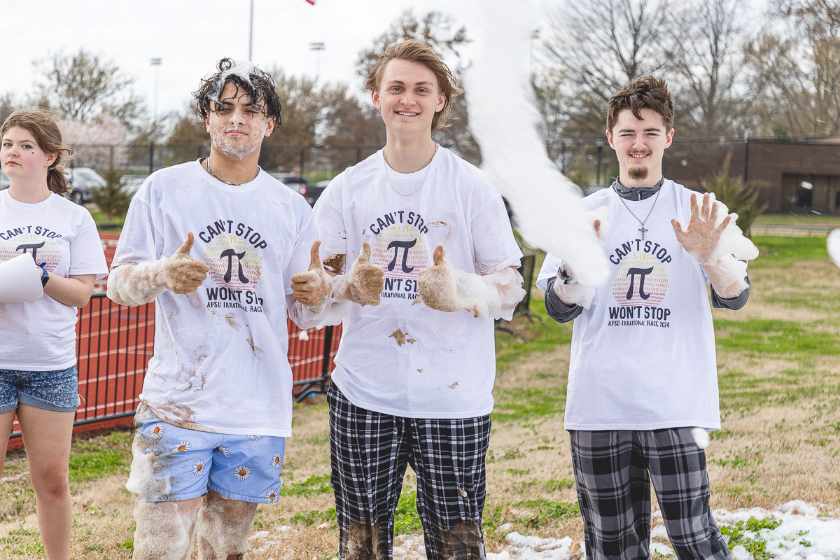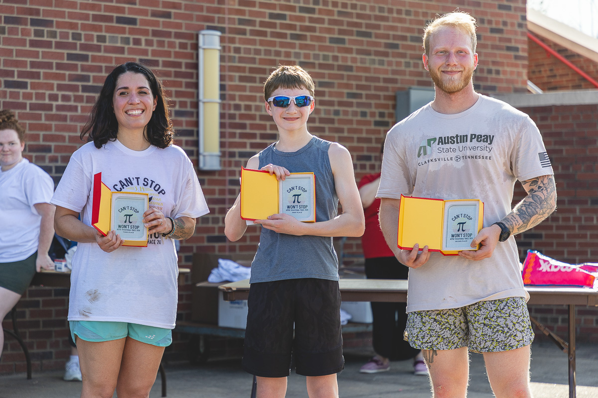CLARKSVILLE, TN (CLARKSVILLE NOW) – The Austin Peay State University Department of Mathematics and Statistics celebrated Pi Day at Fortera Stadium with a variety of activities. The first 200 attendees received a shirt and sticker. Activities ranged from a 3.14-mile race to a pie-eating contest, trivia, foam cannon, pie-in-the-sky Frisbee contest, and a 3.14-legged race.