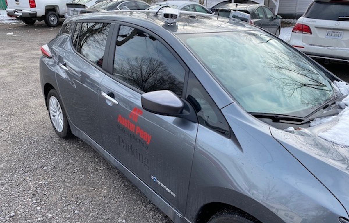 CLARKSVILLE, Tenn. – On a cold, rainy afternoon in late February, a Nissan Leaf with cameras mounted to the roof moved silently through the Austin Peay State University campus. When the electric vehicle passed a group of students, they paused beneath umbrellas to watch the strange-looking car.