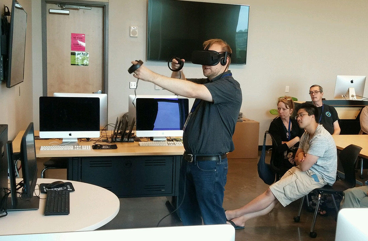Scott Raymond, APSU assistant professor of art + design and former DreamWorks animator, unpacked two of the University’s new virtual reality systems so attendees could walk through 3D virtual paintings they made.