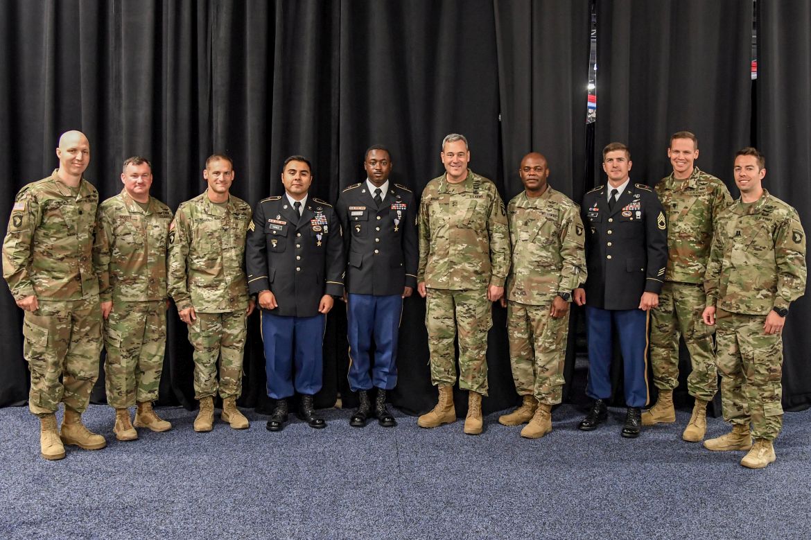 McConville, a former 101st Abn. Div. (Air Assault) commander, pinned the medals on Sgt. Armando Yanez and Sgt. Emmanuel Bynum following his keynote address at the summit, an annual gathering of the Army aviation community.