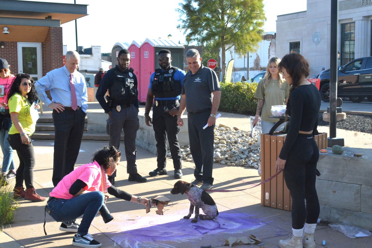 Third place Chalk Walk winner, Lana Conder & Lenny, at tthe 3rd Annual Artsville Fest with the ArtLink Team in downtown Clarksville on Oct. 7, 2023. (Lee Erwin)