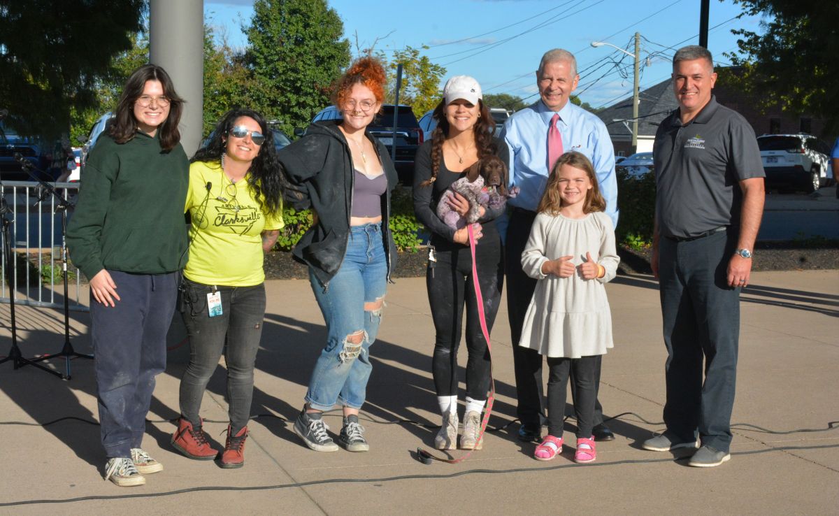 Karley Sugg, Maria Haycraft, Chloe Ficklin, Lana Conder with Lenny, Mayor Joe Pitts, Sabrena Wise & Andrew Kester at the 3rd Annual Artsville Fest with the ArtLink Team in downtown Clarksville on Oct. 7, 2023. (Lee Erwin)