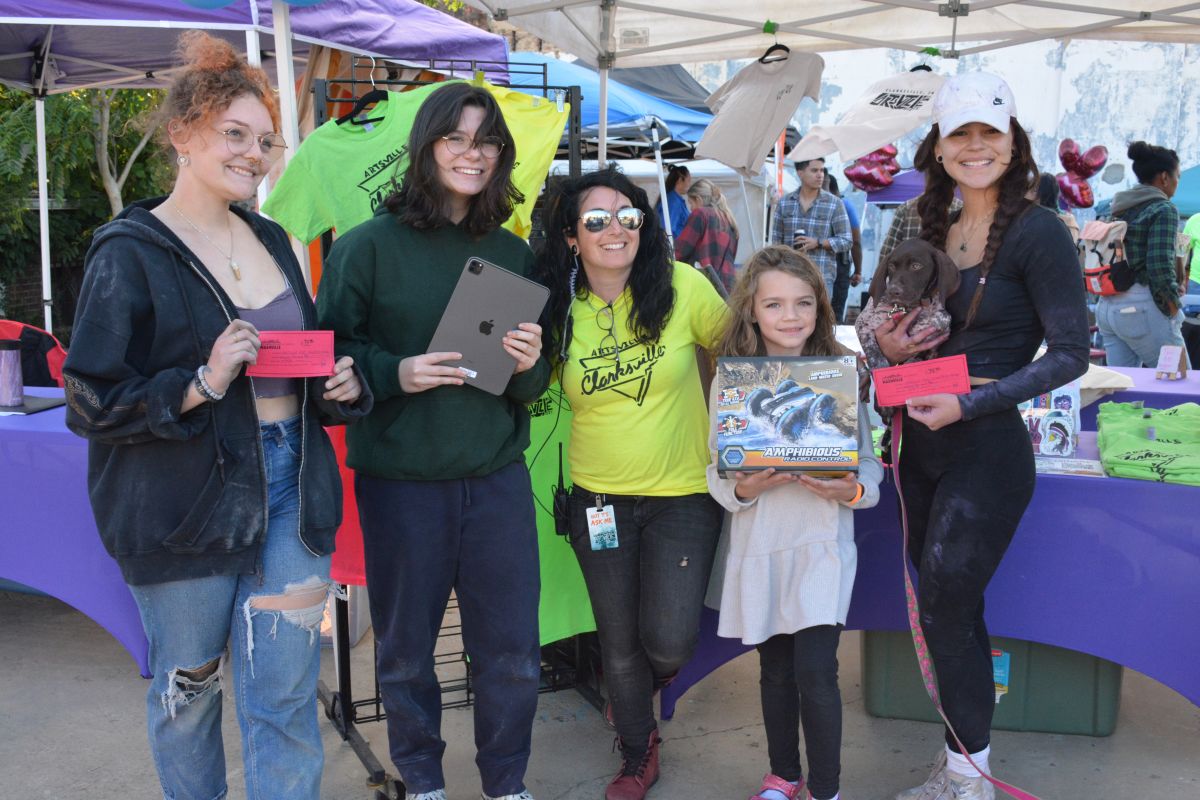 Chloe Ficklin, Karley Sugg, Maria Haycraft, Sabrena Wise & Lana Conder with Lenny, Chalk Walk winners at the 3rd Annual Artsville Fest with the ArtLink Team in downtown Clarksville on Oct. 7, 2023. (Lee Erwin)