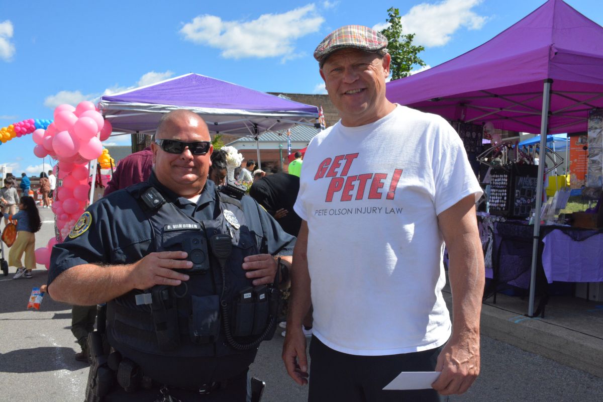 Clarksville Police Officer Bill Van Beber & Pete Olson at the 3rd Annual Artsville Fest with the ArtLink Team in downtown Clarksville on Oct. 7, 2023. (Lee Erwin)