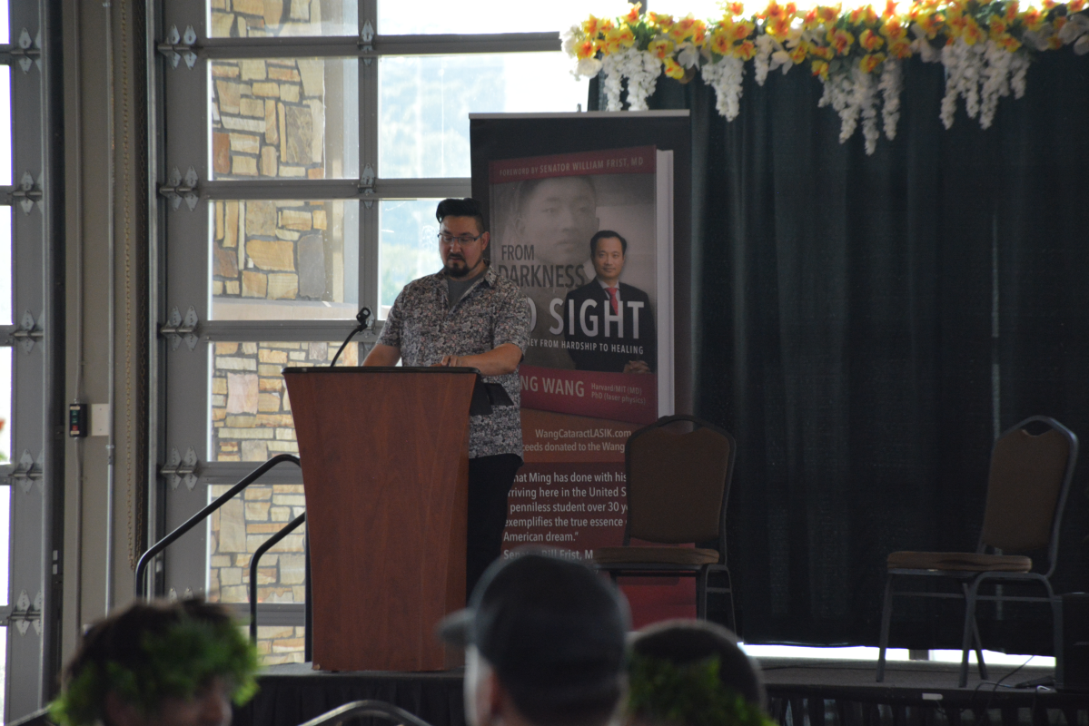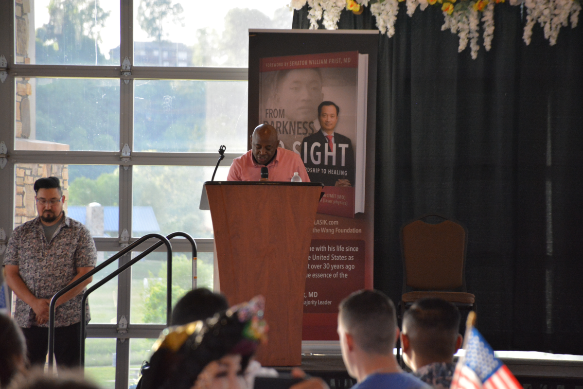 The MC preparing to address the crowd at the Asian-American Pacific Islander Event at the Wilma Rudolph Event Center on May 27, 2022. (Angela Peterson)