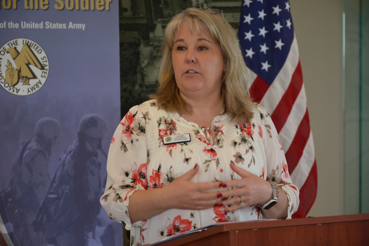 Association of the United State Army (AUSA) Executive Director, Tina Englen, speaks at the organizations Quarterly Membership Breakfast, on Thur. Mar. 17,2022. (Lee Erwin)