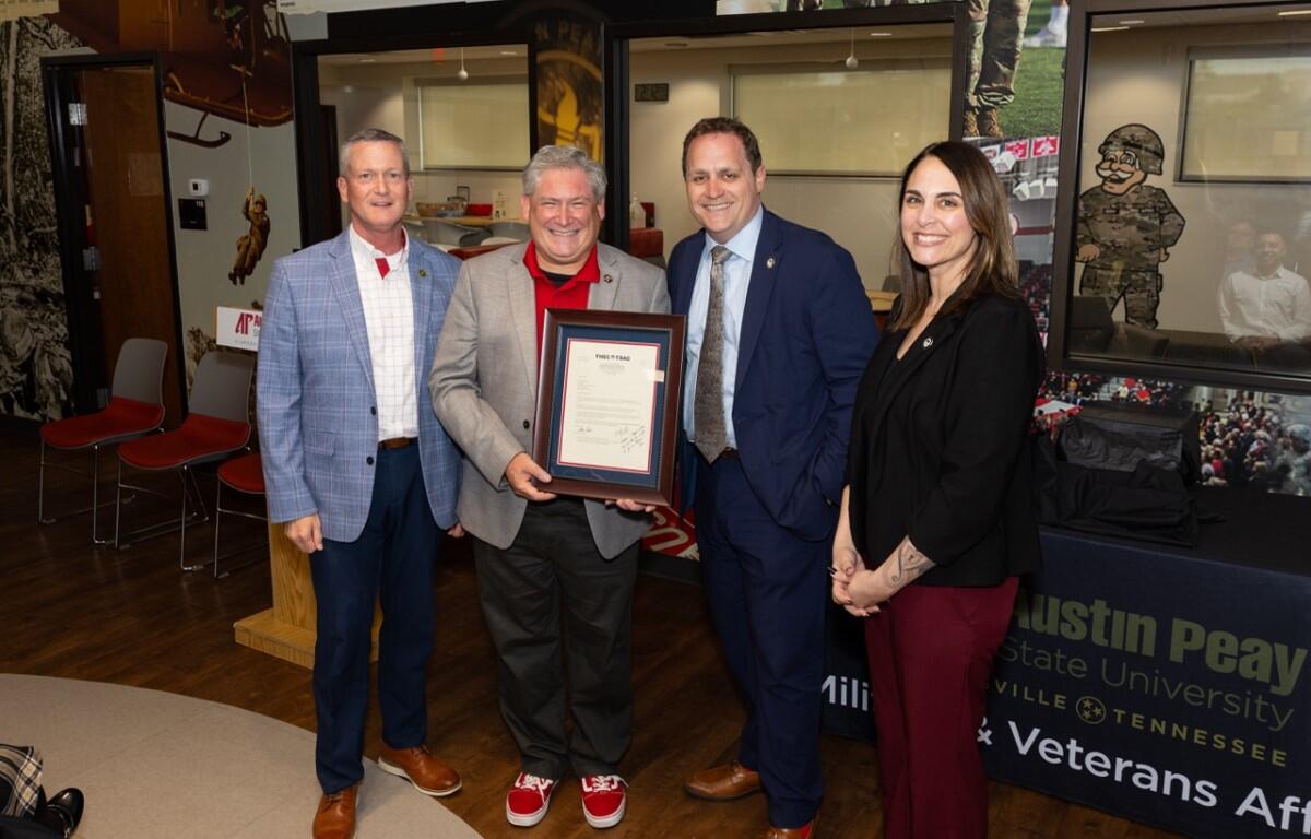 “A year ago, the General Assembly and the governor thought about how we can go even further to ensure that our campuses are providing student mentorship, regularly surveying and talking to their veterans and military families to ask what we can do more for them and opening up direct lines of contact to local career and entrepreneurship opportunities,” he said. “The moment we put this application out, Austin Peay responded quickly, and so it’s my honor to recognize Austin Peay for this Bravo-level designation.