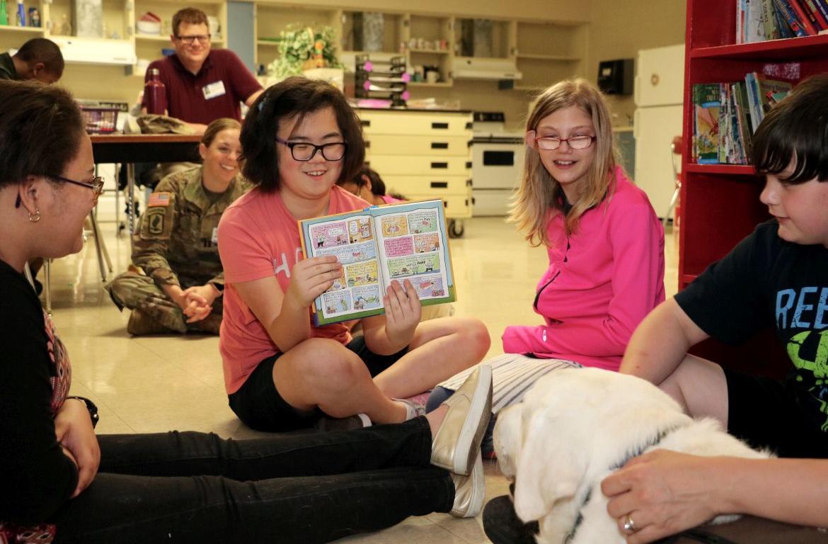 FORT CAMPBELL, Ky. (CLARKSVILLENOW) – It was puppy love when volunteers from Blanchfield Army Community Hospital brought a therapy dog to visit students at Clarksville, Tennessee’s Northeast Middle School recently.