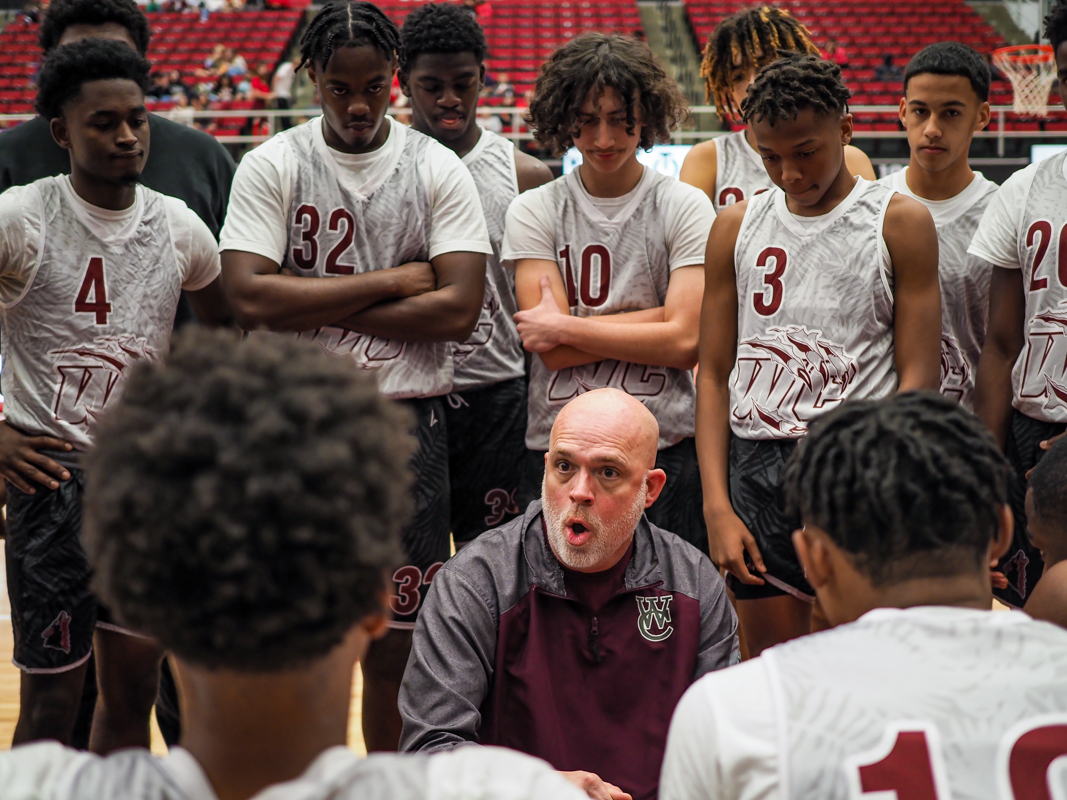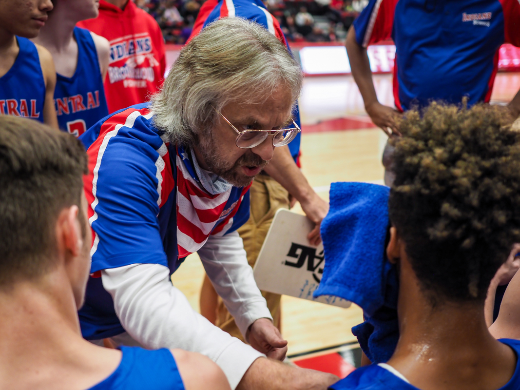 Coach Mike Brown as the Montgomery Central High School boys Indians play the West Creek Coyotes at the CMCSS basketball jamboree on Nov. 8, 2021. (Ryan Vinson)