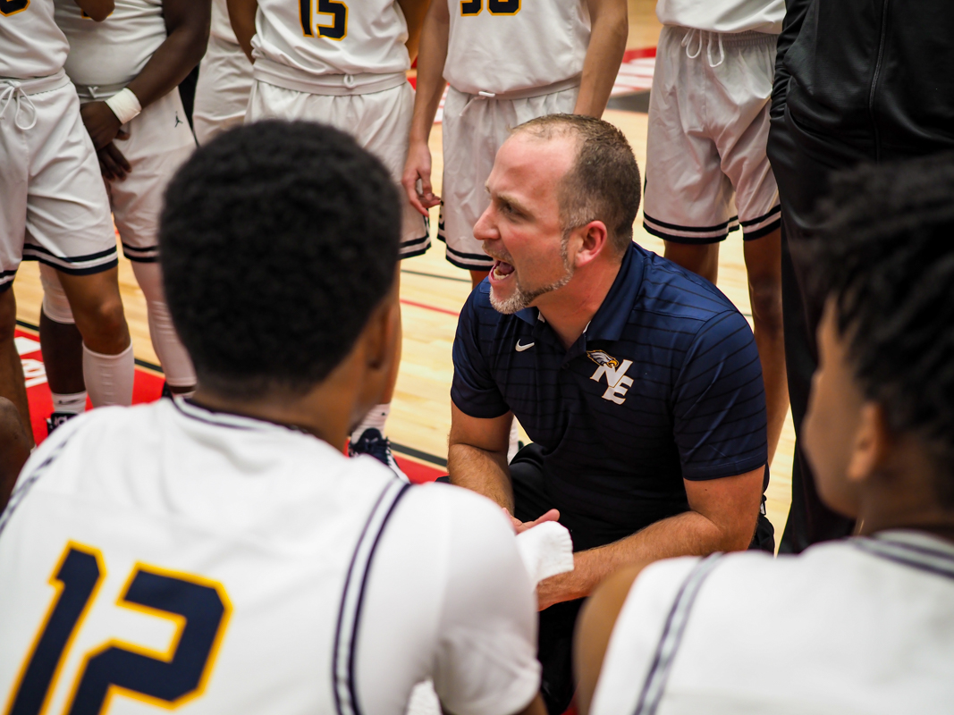 Coach Tyler Hickman as the Northeast High School boys Eagles play the Clarksville Academy Cougars at the basketball jamboree on Nov. 8, 2021. (Ryan Vinson)
