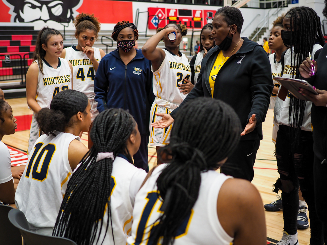 Coach Tracie Mason-Blair as the Northeast High School girls Eagles play the Clarksville Academy Cougars at the basketball jamboree on Nov. 8, 2021. (Ryan Vinson)