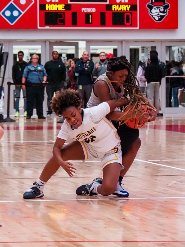 Adryanna Smith, left, and Shinae Johnson, right, as the Northeast High School girls Eagles play the Clarksville Academy Cougars at the basketball jamboree on Nov. 8, 2021. (Ryan Vinson)