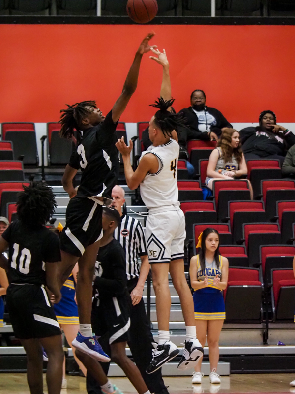 Dez Fort, left, and Keith Richburg, right, as the Northeast High School boys Eagles play the Clarksville Academy Cougars at the basketball jamboree on Nov. 8, 2021. (Ryan Vinson)