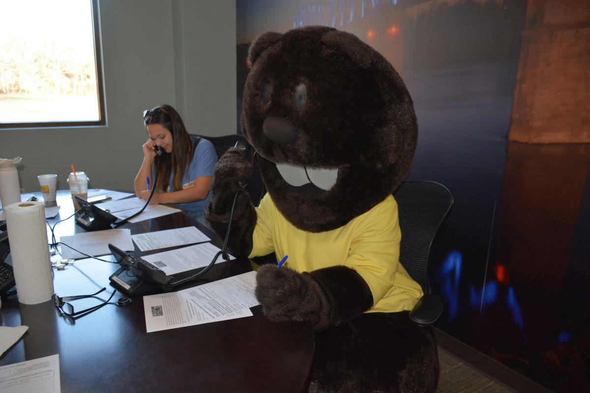 Bucky Beaver helps out with phone calls at the Beaver 100.3 Camp Rainbow Radiothon, on Feb. 18 2022. (Lee Erwin).