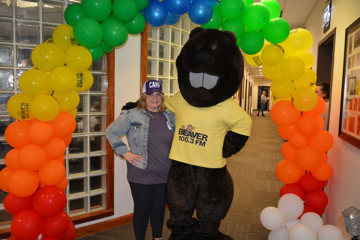 Mandi Michaels poses with Bucky Beaver at the Beaver 100.3 Camp Rainbow Radiothon, on Feb. 18 2022. (Lee Erwin).