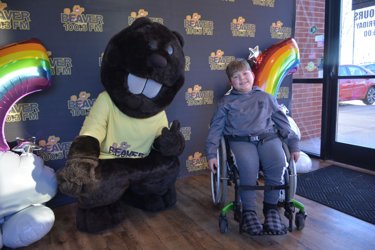 A youngster poses with Bucky Beaver at the Beaver 100.3 Camp Rainbow Radiothon, on Feb. 18 2022. (Lee Erwin).