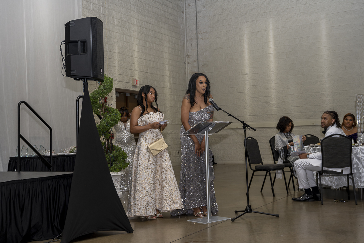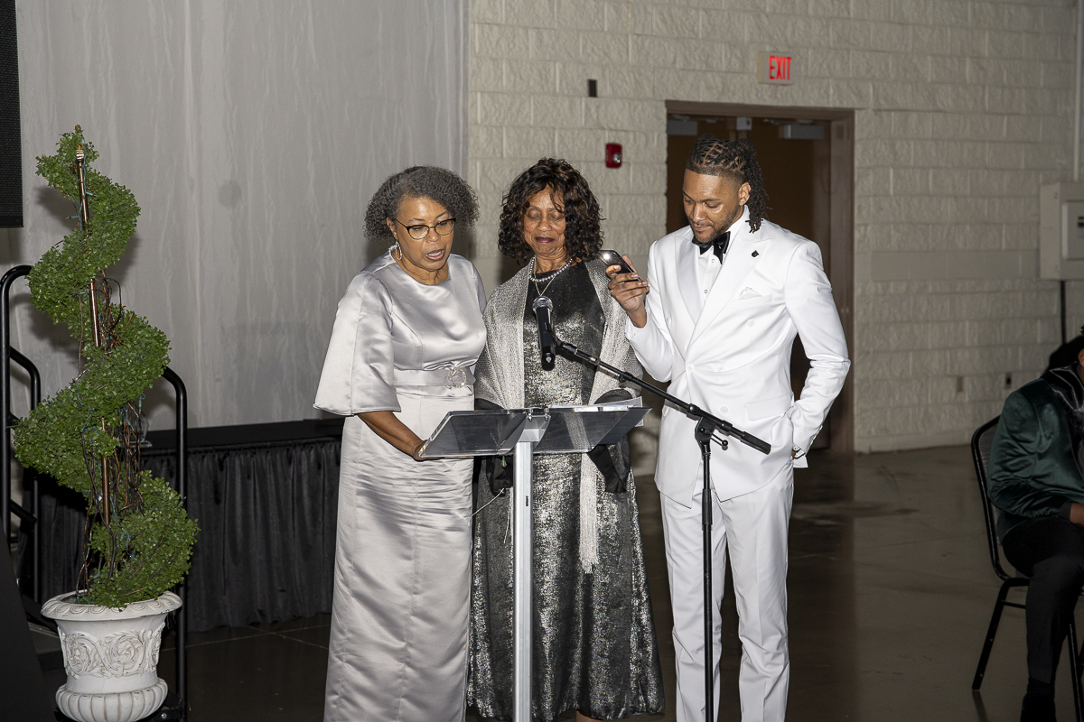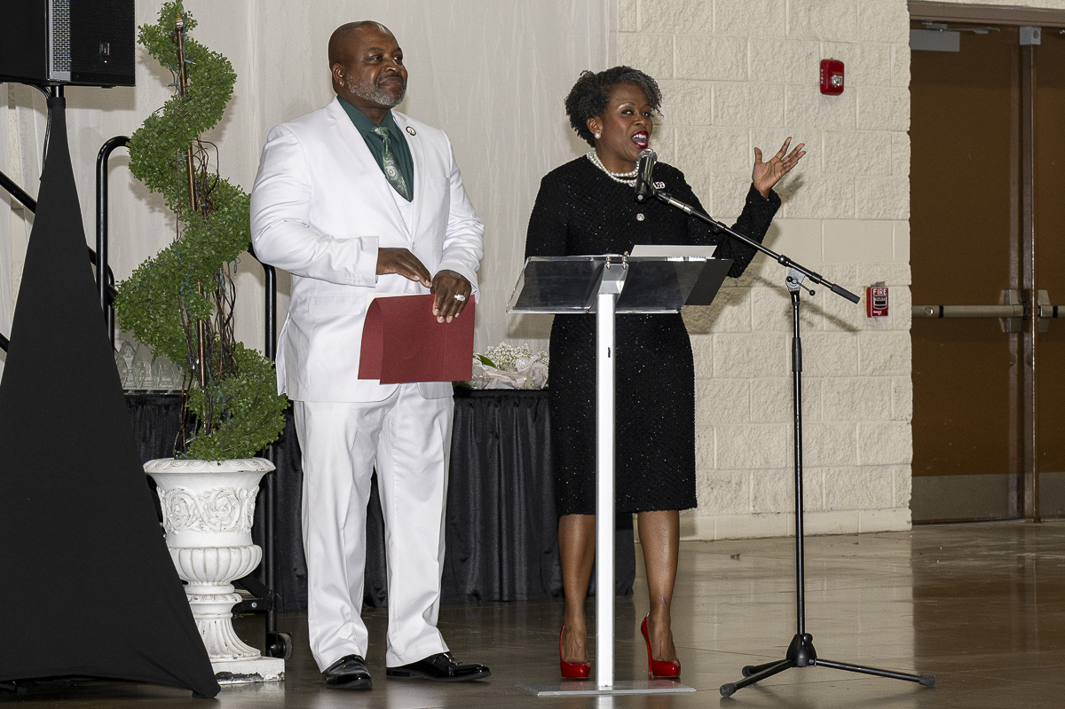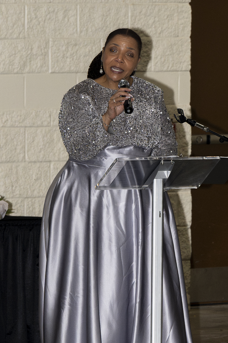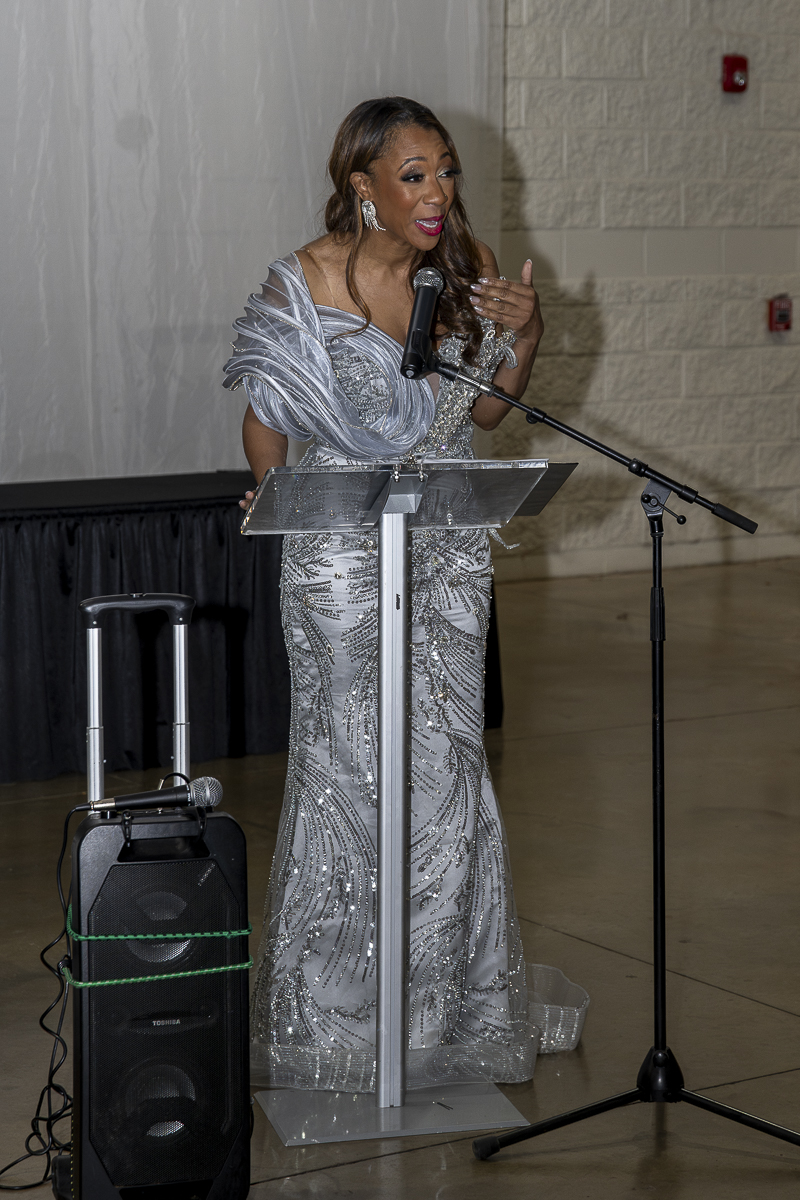 Sheila Petrie gives the introduction of Master of Ceremony at the Alpha Kappa Alpha Sorority, Incorporated Nu Kappa Omega Chapter Belles and Beaus Finale Ball on February 8, 2025 (Jeff Danault)