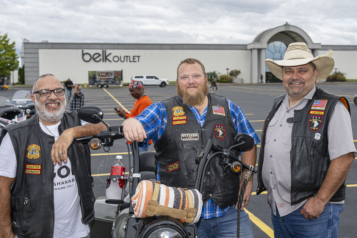Rodney Ortiz, Robert Hernandez, and Steven Grissom of the Clarksville Chapter of the Christian Motorcycle Association at the 43rd Annual Leslie W. Watson Memorial Toy Run. September 14, 2024. (Jeff Danault)