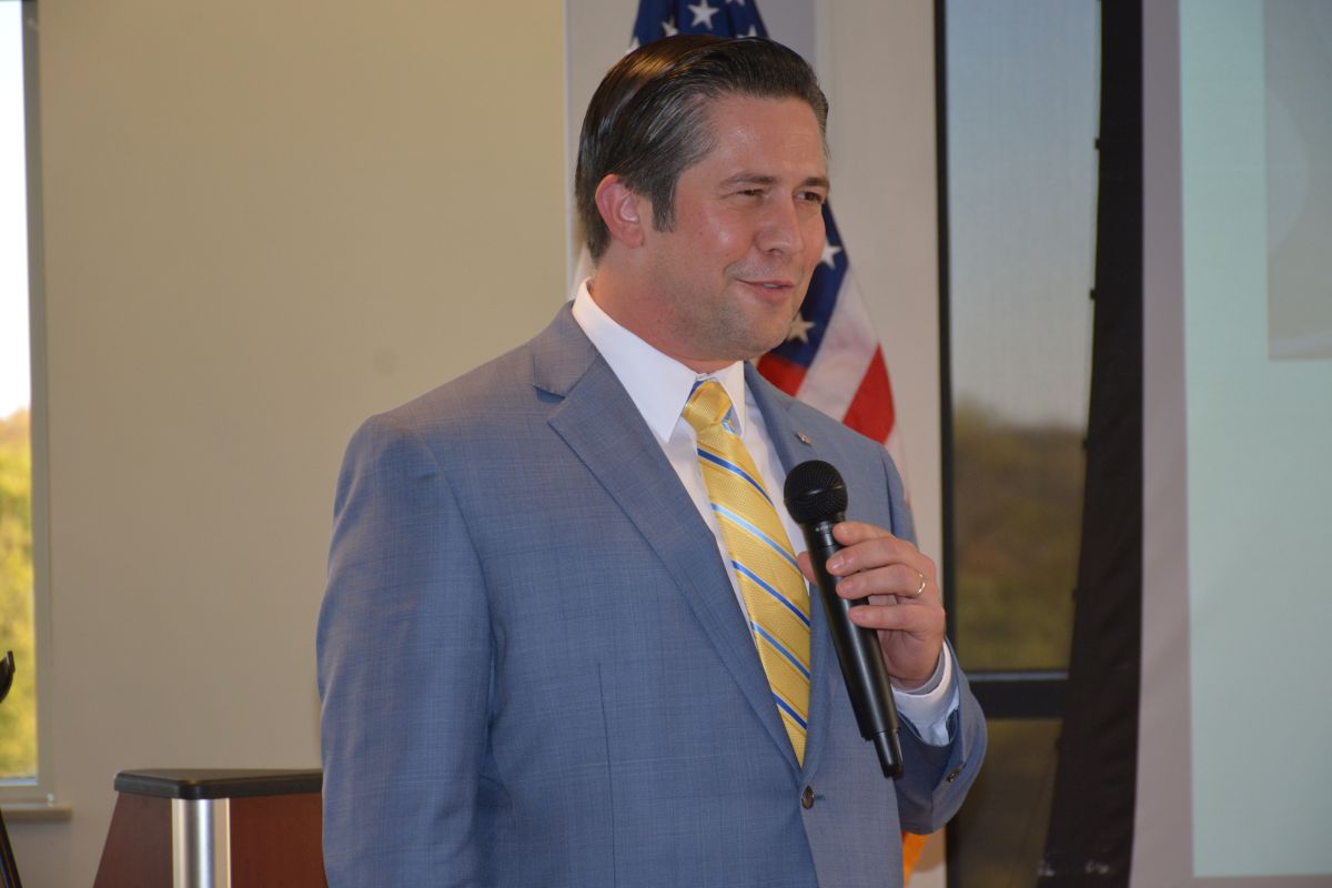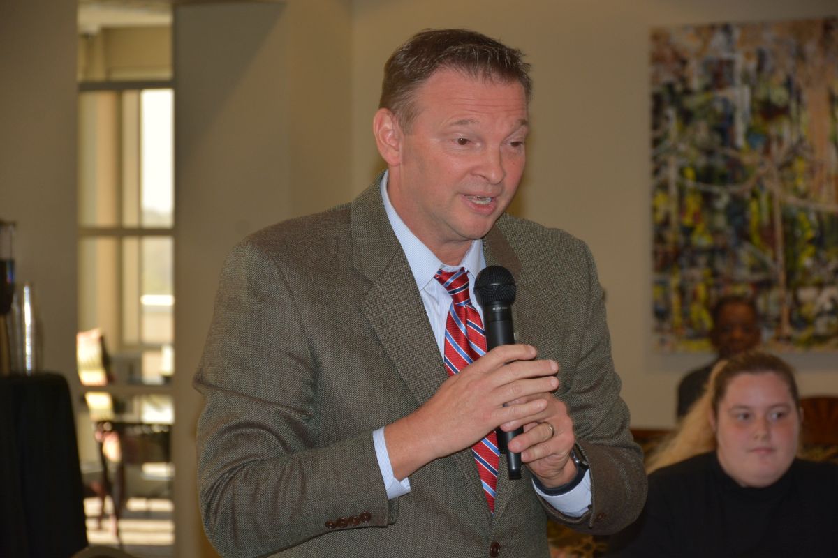 Montgomery County Mayor Wes Golden recognizes Bill Wyatt for his contributions to the community during the announcement of an endowment, the Bill Wyatt Distinguished Professorship Award by the Clarksville-Montgomery County Community Health Foundation, to APSU on, Oct 19, 2022. (Lee Erwin).